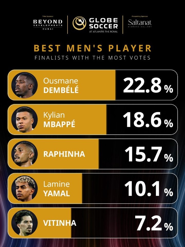 足球比分网12月11日讯 环球足球奖公布了2025年最佳男足球员的投票情况,登贝莱22.8%领跑,姆巴佩18.6%次席。 环足奖最佳男足球员投票前五名: 登贝莱——22.8% 姆巴佩——18.6% 拉菲尼亚...