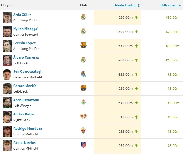 足球比分网12月12日讯 今日德转更新了西甲球员身价,姆巴佩重回2亿欧,与亚马尔和哈兰德并列世界第1,贝林厄姆跌至1.6亿,亚马尔和维尼修斯不变,居莱尔暴涨3000万至9000万欧。 德转...