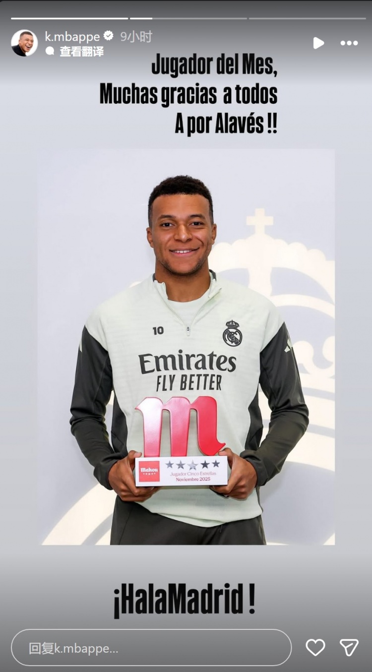 足球比分网12月13日讯 姆巴佩更新社媒动态,晒出领取皇马月最佳球员奖杯的照片。 姆巴佩当选皇马队内11月最佳球员,他在社交媒体上晒出领奖照片,配文:“月度最佳球员,非常感...