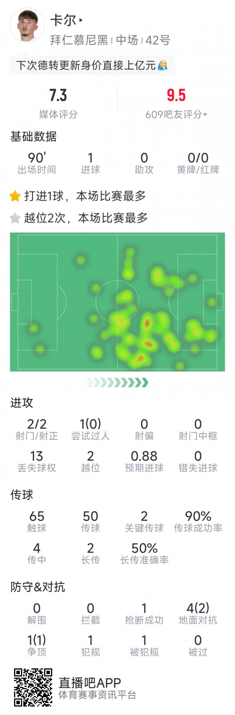 足球比分网12月15日讯 在本轮德甲,拜仁2-2战平美因茨。 本场比赛卡尔破门,以下为他在本场数据: 比赛时间90分钟 1粒进球 2次射门均射正 65次触球 2次关键传球 传球成功率90% 1次抢断...