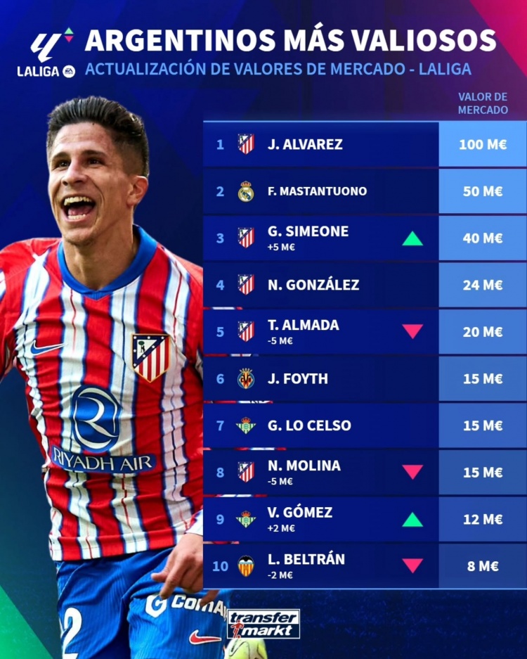 足球比分网12月13日讯 德国转会市场更新了西甲球员的身价,并列出西甲阿根廷球员身价排名,阿尔瓦雷斯1亿欧居首,马斯坦托诺5000万欧次席。 西甲阿根廷球员身价排名: 阿尔瓦雷斯...