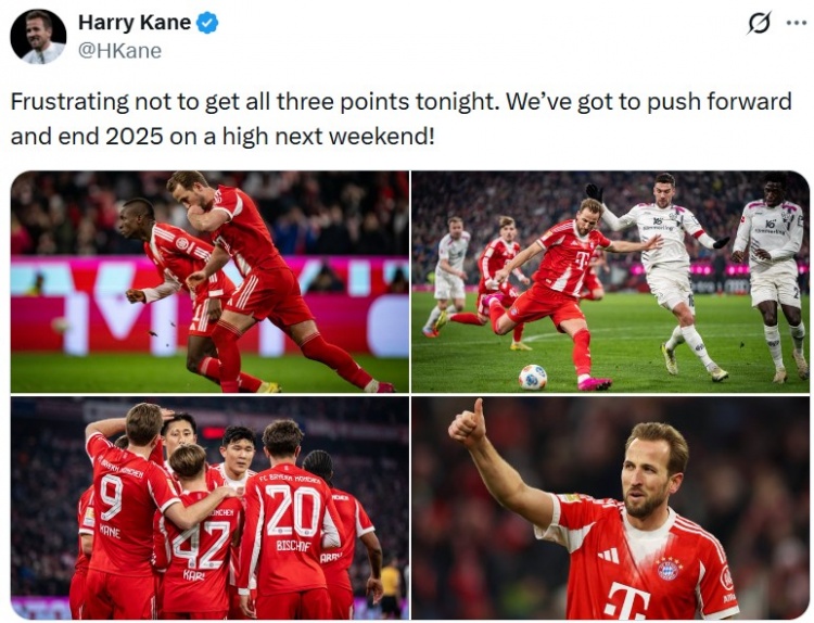 足球比分网12月15日讯 在本轮德甲,拜仁2-2战平美因茨。 本场比赛凯恩点射破门,赛后他在社媒鼓励球队写道:“很失望今晚未能全取三分,我们必须全力以赴并在下周比赛中为今年完...