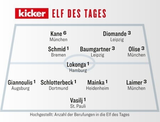 足球比分网12月8日讯 德国媒体《踢球者》评出了德甲第13轮最佳阵容,凯恩、奥利塞、莱默尔、施洛特贝克在列。 踢球者德甲第13轮最佳阵容: 门将:瓦西里(圣保利) 后卫:吉安努...