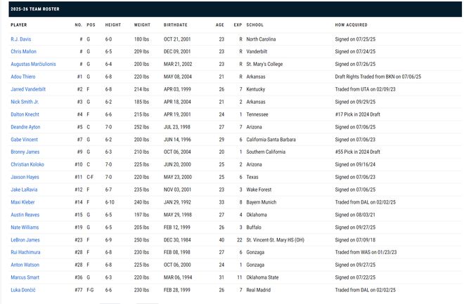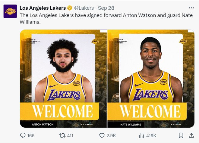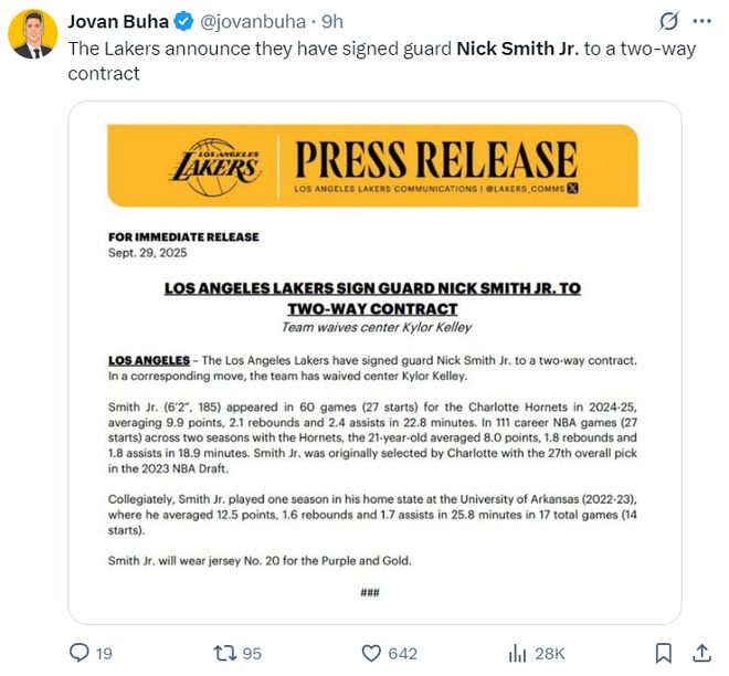 北京时间9月30日,根据湖人队记约什-布哈的报道,湖人队已经用双向合同签下了小尼克-史密斯,史密斯上赛季场均9.9分2.1篮板2.4助攻,湖人签下他之后训练营也完成了21人大名单。 两天之前,湖人队用训练营合同分别签下了安通-沃特森和内特-威廉姆斯,湖人队终于完成了21人训练营名单的建立。 湖人2025-26赛季训练营21人名单为: 后卫:东契奇、里夫斯、斯马特、文森特、布朗尼、马农、RJ-戴维斯、马修利奥尼斯、内威、尼克-史密斯。 前锋:詹姆斯、八村垒、拉拉维亚、范德比尔特、克内克特、克勒贝尔、蒂耶罗、安通-沃特森。 中锋:艾顿、海斯、科洛科。 詹姆斯与东契奇的定妆照一出炉很多球迷都会感叹,东契奇已经比詹姆斯都要小一圈了,东契奇今夏的减重的确很成功,可以看出东契奇的手臂、小腿都比詹姆斯更细,据悉东契奇从270磅减到230磅,当然侧面也能说明勒布朗的身材保持的很好,老詹还是算强壮带有一些精瘦。 湖人三巨头的定妆照40岁的勒布朗依旧站在C位上,虽然他今夏未能与球队完成续约,可他还是这个联盟乃至这个世界上最具影响力的巨星。 里夫斯在媒体日之前就接受了采访,他表示在自己拒绝跟湖人达成四年8920万的提前续约后,觉得自己很有可能要被交易,直到现在也觉得自己并不安全。根据TA的预测,里夫斯下一份合同年薪会超过3500万,甚至有机会达到4000万。 随后湖人官方就晒出了多位轮换名单之内球员的定妆照,那么训练营合同的球员目前没有晒出定妆照。新援:艾顿、斯玛特、拉拉维亚都接受了采访。 |