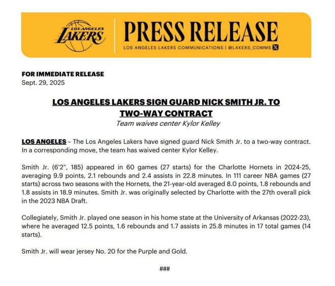 北京时间9月30日,湖人官方宣布一签一裁,球队裁掉中锋凯洛尔-凯利,与小尼克-史密斯签下一份双向合同。小史密斯此前被黄蜂裁掉。随后,湖人官方公布了训练营21人名单,詹姆斯东契奇将率队开启新赛季,冲击总冠军。 小尼克-史密斯身高1米88,体重84公斤。2024-25赛季为夏洛特黄蜂队出战60场比赛(其中27场首发),场均上场22.8分钟,可贡献9.9分、2.1个篮板和2.4次助攻。这位21岁的球员职业生涯效力黄蜂队两个赛季,共出战111场NBA比赛(27场首发),场均上场18.9分钟,得到8.0分、1.8个篮板和1.8次助攻。小史密斯在2023年选秀大会上以首轮第27顺位被黄蜂队选中。 大学时期,小史密斯曾在故乡的阿肯色大学效力一个赛季(2022-23赛季),期间共出战17场比赛(14场首发),场均上场25.8分钟,能拿下12.5分、1.6个篮板和1.7次助攻。新赛季,小史密斯将身披湖人的20号球衣征战。 湖人官方公布了训练营21人名单如下:5号艾顿、55号RJ-戴维斯、77号东契奇、28号八村垒、11号海耶斯、9号布朗尼、23号詹姆斯、14号克勒贝尔、4号克内克特、10号科洛科、12号拉拉维亚、30号马农、31号马丘里奥尼斯、15号里夫斯、36号斯马特、20号小尼克-史密斯、1号蒂耶罗、2号范德比尔特、7号文森特、41号沃特森、50号内特-威廉姆斯 其中,三个双向合同名额已满,分别是马农、科洛科和小尼克-史密斯。 新赛季的湖人能走多远?欢迎大家发表见解。 |