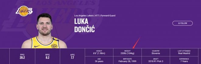 湖人官方更新东契奇体重,从270磅瘦到230磅