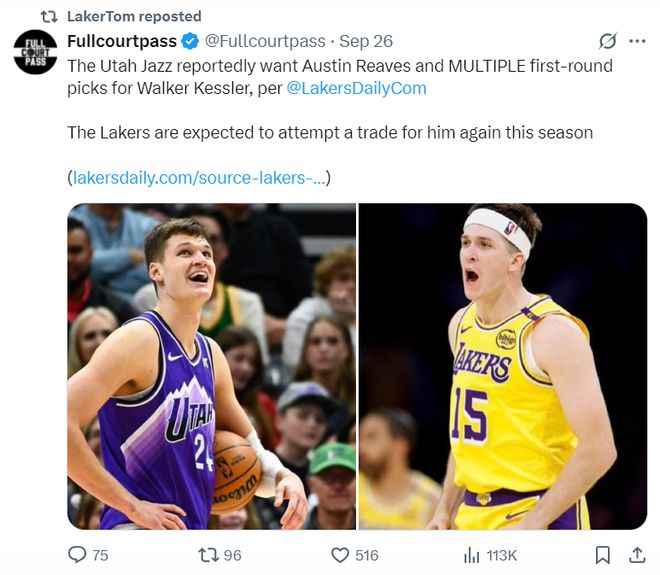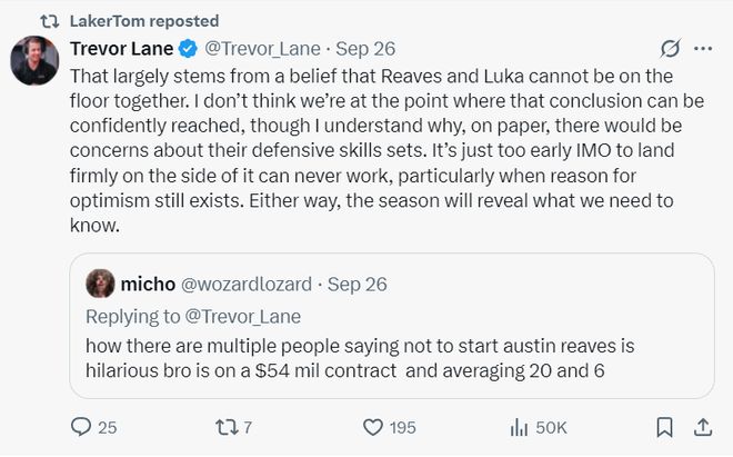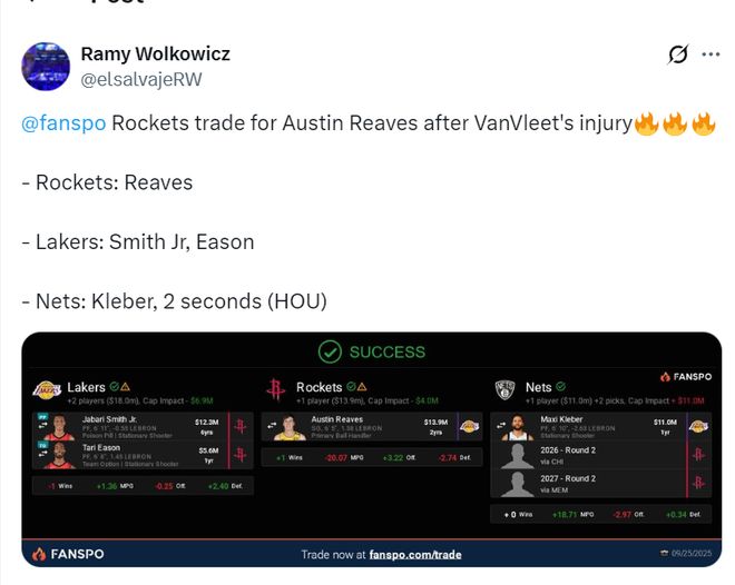 近日,NBA名宿霍里在播客节目中谈到卢卡-东契奇与奥斯汀-里夫斯不兼容的话题,他明确表态这两人都是持球手且防守端表现均不佳,湖人想要夺冠不可能将两个防守漏洞一同放在先发阵容,湖人最好的选择是交易掉场均20+6的里夫斯。 两天之前,根据湖人国度的报道,湖人与爵士可能重启关于凯斯勒的交易谈判,因为今夏爵士与凯斯勒的提前续约陷入僵局,如果湖人同意用里夫斯+3个首轮签换凯斯勒那么交易可能会达成。 随后有湖人球迷表达不满,但湖人记者Trevor Lane回应:主要原因是球迷们都认为里夫斯、东契奇不该同时留在场上,这两人同时在场让其余球员的防守压力过大,长此以往绝对不是好的选择,当然这种说法可能为时尚早。 在BR记者杰克-费舍尔报道火箭队与塔里-伊森的提前续约谈判也陷入僵局后,湖人媒体Laker Tom点赞,湖人大VYinoma2001还转推发了一个思考的表情包。 随后湖人媒体Ramy就建议了一套三方交易方案,他觉得这笔交易可以在12月15日后进行。 火箭得到:小贾巴里-史密斯、塔里-伊森; 火箭得到:奥斯汀-里夫斯; 篮网得到:马克斯-克勒贝尔、黄蜂2026年次轮签、灰熊2027年首轮签; 湖媒认为火箭队正缺少一个组织者,里夫斯可以扮演这样的角色,而且里夫斯还是一个进攻能力很强的后卫,他在火箭的防守体系下可以很好的被保护起来。而湖人队则得到一个顶级的3D侧翼与一个先发水准的空间型四号位,勒布朗的压力会大幅降低。(我个人觉得这种交易建议纯粹是打劫休斯顿火箭队) |