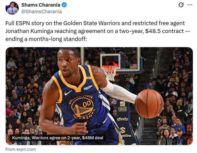 2年4850万,勇士队续约库明加!兄弟同台升级15