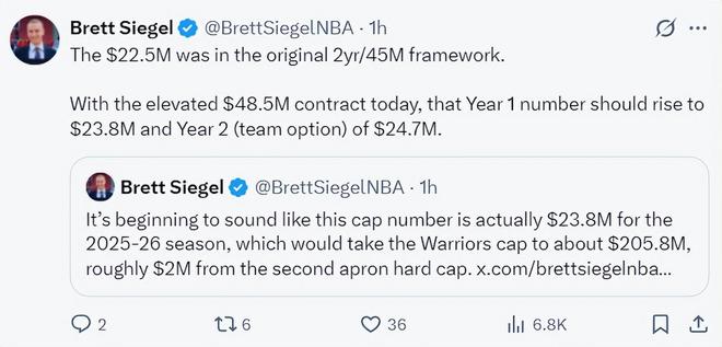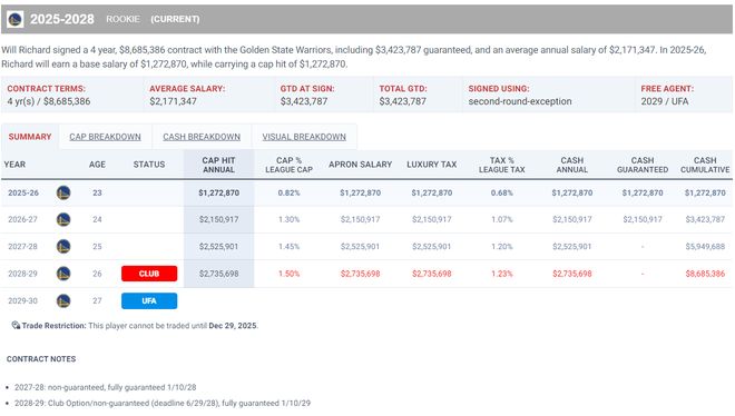 北京时间10月1日,随着勇士队敲定了乔纳森-库明加两年4850万的合同,梅尔顿、霍福德、小佩顿、小库里、理查德等人都接连完成了最终的签约。那么这签约的6人合同细节也随之曝光。 原本库明加跟勇士的合同是两年4500万,最终谈到两年4850万,这份合同是1+1(包含球队选项、库明加放弃交易否决权)。起薪也从2250万上浮到2380万,第二年的薪水为2470万。 霍福德跟勇士队签下的是一份两年1200万的合同,第二年为球员选项,霍福德的合同细节,25-26赛季570万(全额中产特例),第二年为630万。 丹东尼-梅尔顿跟勇士队签下的合同是两年682万,他25-26赛季薪水为328.74万(但只计入229.6万的底薪)剩余的联盟补贴,第二年薪水353.5万,只有245.7万计入工资工资帽,剩余的还是联盟补贴。换言之勇士只给他两年底薪合同,也只占据底薪的空间。 小库里是最后签约的那个,勇士队只剩下底薪空间,也就是230万,他跟勇士队签下的是一年合同,那么小库里最终的合同就是一年230万。 小佩顿跟勇士队签下的是一年330万的合同,他的合同跟梅尔顿的类似,他只有229.6万计入勇士队的工资帽,剩余的联盟补贴,所以勇士队签下他还是用老将底薪。 最后一位是威尔-理查德,他是今年56号秀他跟勇士队签下一份四年869万的新秀合同,合同前两年保障,后两年不保障+球队选项,第一年薪水127.2万,第二年215万,第三年252万,第四年273万。 联盟签约这六人后勇士队已经完成15+3名单,新赛季勇士队大概率的12人轮换就如上图,勇士队也无需用死亡五老打先发。 |