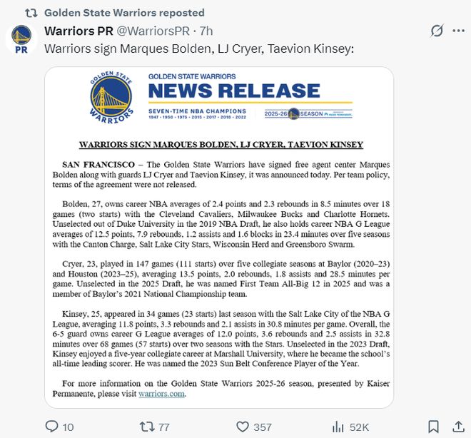 北京时间9月30日,金州勇士队的媒体日,7小时前勇士队官方宣布连续签下马奎斯-博尔登、LJ克莱尔、泰维恩-坎西; 五小时前勇士队官方又宣布,用一份双向合同签回了帕特-斯潘塞,如此一来勇士队三个双向合同就确定了:图希、斯潘塞、罗维; 两小时前勇士队官方又宣布,接连裁掉了贾维尔-弗朗西斯、查恩-麦克米利安和杰克森-莫尼,换言之短短5小时内勇士队实现了3裁4签,除了斯潘塞之外新签约的三人都是训练营合同。 从勇士队官方网站可以得知完成3裁4签后球队训练营名单还是维持在19人:库里、巴特勒、追梦、穆迪、希尔德、波杰姆斯基、桑托斯、戴维斯、波斯特、霍福德、佩顿、梅尔顿、理查德、罗维、图希、斯潘塞、马奎斯-博尔登、LJ克莱尔、泰维恩-坎西。 训练营名单最多可以有21人,目前是19人还剩下两个席位,这其中一个席位大概率就是给乔纳森-库明加留的,另一个席位可能是给赛思-库里留的(不确定),勇士队在短短一天之内连续签下了多位轮换球员:霍福德、小佩顿、梅尔顿、理查德、图希、斯潘塞。 很明显勇士队不太希望新赛季的先发五虎是库里、希尔德、巴特勒、追梦、霍福德,他们还是希望库明加可以回归,这样勇士队就不用打先发五虎(平均年龄35.8岁),库明加是一位很有潜力的锋线,这也是为何勇士队不太想先签后换送走他的关键所在。 |
