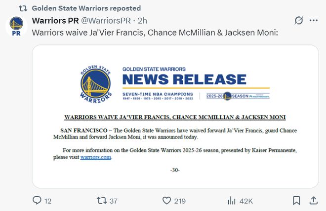 勇士5小时内3裁4签:训练营名单仅19人 为库明加