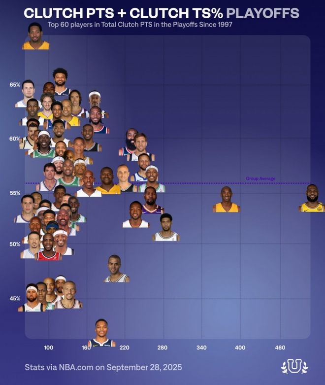 9月29日。有著名媒体NBA University统计并公布了从NBA官方有数据统计的1997年至今,在季后赛关键时刻(这有传统标准:最后5分钟分差在5分以内)得分表现(包括得分和效率)同期前六十的球员。其中詹姆斯是总得分王,而向来季后赛高端局和生死战拉胯的哈登,在一般的关键时刻效率比同样关键时刻拉胯的库里还高。 这个坐标图,横轴是总得分,纵轴是效率。横轴越靠右,得分越高。纵轴越往上,效率越高。 效率指的是真实命中率,霍里最高,不愧是外号“关键先生”,也拯救过奥尼尔和科比的七冠王,只不过得分很少,毕竟是角色球员。詹姆斯的总得分不仅是同期第一,而且是历史第一,还是独一档,而且效率也高于五成。威斯布鲁克是上榜中效率独一档低的球员,而科比一堆大腿队友在榜上,可见他的大腿多粗、多多。 得分最高一档是460分,而詹姆斯超过这个标准,独一档。有其他数据统计过,詹姆斯职业生涯在关键时刻的进球超过1000个!历史独一档。詹姆斯关键时刻的真实命中率超过55%,比科比更高。科比的关键时刻得分同期第二,落后詹姆斯很多,但也比其他球员多不少,真实命中率低于詹姆斯,不过也大概是五成。 邓肯的关键时刻得分和真实命中率都不如科比,他的得分比杜兰特和韦德多一点,效率则低一点。其他上榜的还有奥尼尔、汤普森、加内特、巴特勒、米切尔等,基本都是超巨或者球星。其中威斯布鲁克的效率是独一档的低,最低一档是45%,而威斯布鲁克的效率比底线还低。 |