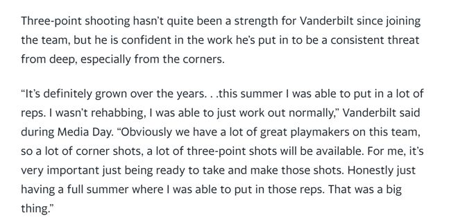 湖人的训练营中,26岁的防守悍将范德比尔特成为一大亮点,他完全恢复了健康。经过几年的伤病折磨之后,范德比尔特终于可以在没有任何限制的情况下进行训练和比赛。范德比尔特有了一个完整的夏天打磨自己的球技。2025年夏天,范德比尔特的打磨重点是三分球。他期待自己变成真正的3D球员。 范德比尔特的防守已经得到了主帅雷迪克的称赞。“他的身体形态和技术动作进步显著,与之前相比简直是天壤之别,他看起来就像是受伤前的自己。上赛季由于他的身体没有在最佳状态,我不得不将他置身于小阵容五号位,新赛季的他将恢复运动能力和敏捷性,并重新回到外线领防人的位置。”雷迪克说道。 范德比尔特将做回自己最熟悉的角色,扮演球队外线防守工兵,去防守对方的外线头号得分手,主要是防守侧翼砍分高手。这是范德彪在受伤前最擅长的角色。范德彪可以在场上打多个位置,但他最喜欢的还是小前锋或者大前锋。 范德比尔特在这个夏天苦练了三分球。来到湖人后,三分球一直不是范德比尔特的长项,但是他相信自己夏天的努力会获得回报,相信自己在外线,尤其是底角会构成威胁。 “这些年来,我的三分球确实进步了……今年夏天我进行了很多的训练。我不是进行康复训练,只是正常地训练,显然,我们队里有很多优秀的组织核心,所以有很多底角投篮和其他位置的三分投篮机会。对我来说,做好准备出手并且命中这些投篮非常重要。说实话,整个夏天我都能够进行这些训练。这对我来说意义重大。”范德比尔特说道。 在之前的几个夏天,范德比尔特不得不花很长时间来进行康复训练。而今年夏天,范德比尔特全身心投入到打磨自己的球技上。 上赛季受伤病影响,范德比尔特只打了36场比赛,场均得到4.1分5.1个篮板1.1次助攻1次抢断,投篮命中率为48.8%,三分命中率28.1%,罚球命中率为55.6%。 范德比尔特职业生涯的三分命中率为28.8%,在湖人效力过的两个半赛季里,范德比尔特三分命中率为29.3%。可以说,范德彪的三分球确实需要升级。而这个夏天的苦练,或许真的让他的三分技能进化了。 |
