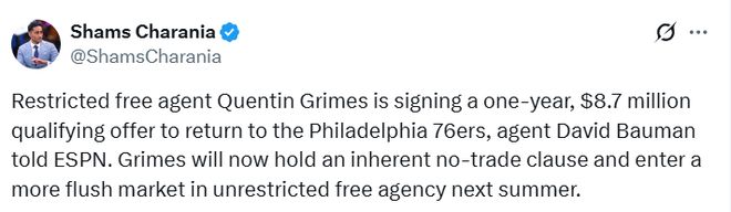 北京时间10月2日,据名记Shams报道,费城76人队受限制自由球员昆汀-格雷姆斯已决定接受一份为期一年、价值874万美元的资质报价。 当地时间周三是格雷姆斯就这份资质报价做出决定的最后期限。接受报价意味着这位25岁后卫与球队长达三个月的僵持正式结束,他将在2026年休赛期成为完全自由球员,同时在2025-26赛季拥有交易否决权。 25岁的格雷姆斯在NBA职业生涯的前三个半赛季曾效力于尼克斯、活塞和独行侠队,随后在今年2月的交易截止日,他被交易至费城,以换取凯莱布-马丁。 在此之前,格雷姆斯主要担任“3D侧翼”。但在76人队多位核心得分手伤缺、阵容不整的情况下,他承担了更多控球和组织任务,并在赛季后半段交出亮眼数据。作为76人球员,他共出战28场比赛(其中25场首发),场均上场33.7分钟,得到21.9分、5.2个篮板、4.5次助攻和1.5次抢断,投篮命中率、三分命中率和罚球命中率分别为46.9%、37.3%和75.2%。 本赛季末的出色表现,却让格雷姆斯与费城在今年夏天的合同谈判变得复杂。据Shams报道,很大程度上基于格雷姆斯在2024-25赛季后半段的表现,其团队最初寻求一份年薪3000万美元左右的合同,随后将要价降至每年2000万至2500万美元。 然而,76人队因担忧球队的奢侈税和工资帽情况,且可能不愿为球员仅两个月的表现支付过高薪水(当时76人队处于乐透区,无缘季后赛),始终未接近这一报价。据ESPN及其他媒体报道,费城方面曾愿意提供一份4年3900万美元的合同,或一份略高于其资质报价的一年期合同,但这两份报价均要求格雷姆斯放弃潜在的交易否决权。 Shams在最新报道中指出,76人队提出的一年期报价仅比资质报价高出10万美元。与此同时,格雷姆斯团队曾反过来提出两份方案:一份是一年1700万美元的合同,另一份是两年3400万美元且第二年拥有球员选项的合同,但均被76人队拒绝。 Shams表示,76人队如今仍保有格雷姆斯的“鸟权”,并认为球队在明年夏天将处于有利位置——既能在自由市场上与成为完全自由球员的格雷姆斯续约,也能与其他球队达成先签后换交易。 若格雷姆斯在本赛季同意被交易,其新东家在赛季结束后仅拥有他的“非伯德权”。非伯德权允许球队为球员提供最高20%的薪资涨幅,这意味着在这种情况下,当格雷姆斯成为自由球员时,其新东家若想为他提供超过约1050万美元的起薪,需动用薪资空间或其他特例条款。 据ESPN记者马克斯透露,76人队目前的球队薪资总额为1.948亿美元。这一数字远超1.879亿美元的奢侈税起征线,但低于1.959亿美元的第一土豪线。 格雷姆斯是今年四位与母队僵持至9月中下旬的受限制自由球员之一。最终,他与篮网队后卫卡姆-托马斯选择接受资质报价,而公牛队后卫约什-吉迪和勇士队前锋乔纳森-库明加则与球队达成了多年期合同。 |