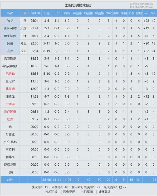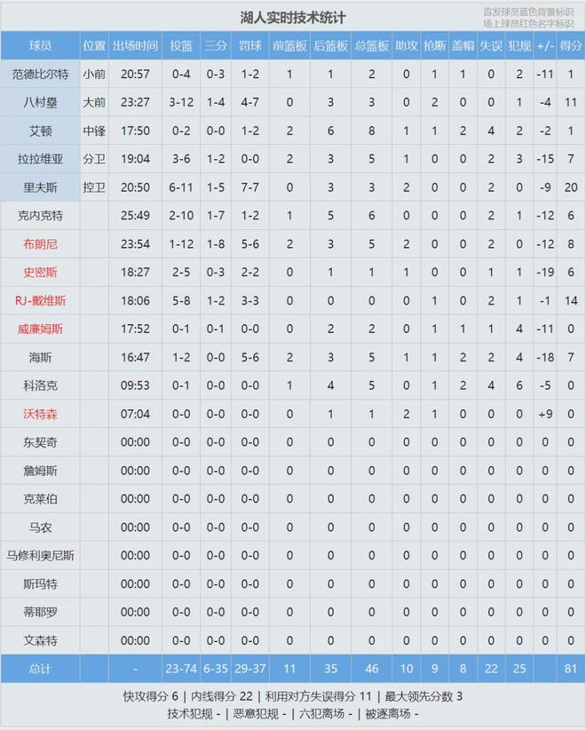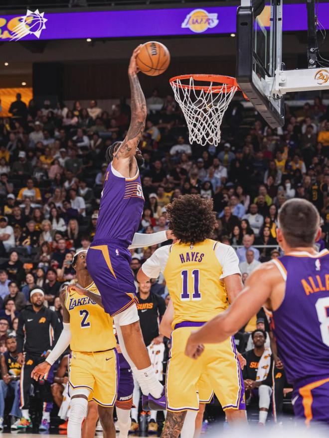 北京时间10月4日,NBA季前赛,湖人vs太阳。湖人5名球员缺阵,太阳这边杰伦-格林不打。湖人首发:里夫斯、拉拉维亚、八村垒、范德彪、艾顿。太阳首发:布克、阿伦、狄龙、瑞安-邓恩、伊戈达罗。 东契奇和詹姆斯都不打,考验里夫斯的带队能力了。湖人中锋海斯透露,今年休赛期增重9公斤,自己不再担心对抗问题。说回比赛,湖人开场紧咬比分,接下来长达7分钟没有运动战进球。太阳打出11比0的攻击波,最多领先到18分。 第一节打完,太阳31-16领先湖人15分。太阳首节10次助攻,湖人全队只有2次助攻。里夫斯单节4中3得到9分,个人进攻没问题,但助攻数是0。第二节八村塁连得6分,布朗尼造杀伤,湖人迫近分差。海斯空接隔扣布克,点燃全场! 上半场打完,太阳58-45领先13分。湖人三分球15中3,外线命中率只有20%。艾顿半场2中0,仅得1分6篮板3失误。里夫斯18分3板2助、八村塁10分。太阳10人上场,均有得分进账,内线得分20比10。布克14分2板5助、狄龙9分。 易边再战,布克两记三分,太阳不断利用反击得手,最多领先到27分。湖人彻底被打懵了!三节战罢,太阳87-62领先整整25分。艾顿2中0,范德彪4中0,克内克特7中1,布朗尼9中1。布克三节打卡,19中8砍下24分7助攻1失误。 第四节双方派上替补,太阳10号秀卡曼-马卢阿奇登场亮相,进攻端出手机会不多。湖人替补后卫RJ-戴维斯连续砍分,他只是Exhibit-10合同。全场结束,太阳103-81大胜湖人22分,太阳内线得分48比22完爆湖人,助攻29比10! 克内克特延续了夏季联赛的糟糕手感,本场投篮10中2,布朗尼投篮12中1。艾顿湖人首秀,2中0仅得1分8篮板2盖帽4失误。最后来看数据,说说你的心情: |