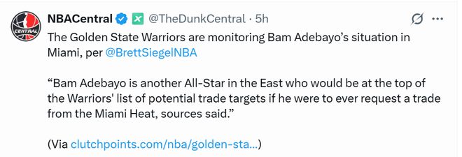 雷速体育10月4日讯 知名NBA账号NBACentral 更新社媒,转发了名记Brett Siegel 有关勇士的报道。 NBACentral写道:消息人士透露,勇士正在关注阿德巴约在迈阿密的情况。“消息人士称,阿德巴约如果向迈阿密热火队提出交易请求,他将位列勇士队潜在交易目标名单的首位。” 阿德巴约曾两次入选全明星,上赛季场均得到18.1分9.6篮板4.3助攻和1.3次抢断。 |
