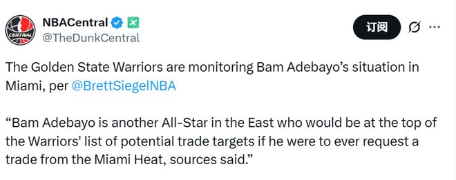 北京时间10月4日,据NBA名记Siegel报道,勇士队正密切关注热火队全明星中锋阿德巴约的动态。阿德巴约目前处于5年1.63亿美元合同的最后一年,2026-27赛季将开始履行一份3年1.6亿美元的续约合同。 2024-25赛季,阿德巴约的表现略显低迷。此前,他在代表美国队参加的夏季赛事中发挥出色,外界本期待他能达到最佳阵容级别。即便如此,他上赛季仍场均贡献18.1分、9.6个篮板和4.3次助攻,且仍是联盟顶尖的防守者之一。目前尚不确定阿德巴约在热火队的未来,但若他进入交易市场,必将成为各队争夺的顶级目标。 热火队尚未释放任何“阿德巴约可被交易”的信号。但如果热火队新赛季开局表现不佳,这一情况可能会发生改变——即便勇士队已签下霍福德,他们仍有望抓住机会推进交易。Siegel表示:“若这位东部全明星(阿德巴约)主动向热火队提出交易申请,他将立刻跻身勇士队潜在交易目标清单的首位。” 美媒指出,若将年薪2320万美元的库明加纳入交易筹码,与热火队的谈判会更顺利。但库明加根本不愿在赛季中期被交易,勇士队也对他寄予厚望——不过,为了得到一位已证明实力的全明星球员,球队或许需要做出牺牲。匹配阿德巴约的薪资并非易事。除了需要付出选秀权外,勇士队还可能需要搭配穆迪、希尔德、佩顿二世、梅尔顿中的部分球员。 热火队与库明加的关联由来已久,且这份兴趣从未减弱。Siegel写道:“自由球员市场开启初期,热火队与鹈鹕队就曾与勇士队就库明加的交易展开过对话。”此外,名记Fischer报道,公牛、国王和太阳也都是对库明加感兴趣的球队。 有报道称,热火总裁莱利不愿达成任何“可能帮助詹姆斯”的交易,而将阿德巴约送到湖人的主要竞争对手(勇士队),或许会让他愿意接受“回报稍低”的交易方案。但只要热火队仍处于争冠行列,阿德巴约就将是球队阵容中的核心一员。 暂且不考虑将阿德巴约交易至勇士队所需应对的复杂问题,单从适配性来看,他正是勇士队需要的球员。本质上,阿德巴约的技术特点有潜力成长为“升级版追梦”。尤其是他日益提升的外线投射能力,将进一步释放他的赛场价值。 此外,阿德巴约还是一名出色的组织型球员——过去六个赛季效力热火期间,他场均能送出4.2次助攻。与格林在勇士队担任进攻发起者的角色类似,阿德巴约也能胜任这一职责,同时还具备篮下、中距离和外线的三层得分能力。他也可扮演传统内线的角色,防守申京、约基奇等西部联盟顶级内线。得益于投篮能力的提升,当与库里配合时,他既能选择挡拆后顺下,也能在必要时外弹投篮,为球队提供战术灵活性。 若勇士得到阿德巴约,还意味着他和巴特勒的再次联手,两人曾在热火当过队友。对勇士队而言,交易得到阿德巴约绝非易事,但他或许正是球队突破瓶颈、重返总冠军争夺行列所需的关键拼图。 |