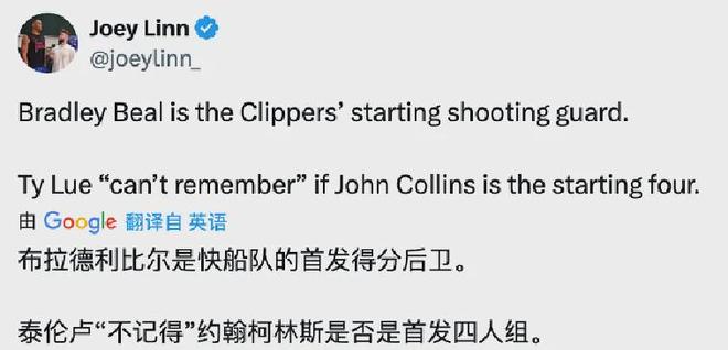 泰伦卢:快船首发五虎已确定4位,分别是哈登+比尔+伦纳德+祖巴茨。 科林斯对此回应道:能首发当然不错,但顺其自然就好。 今夏休赛期,NBA诞生了一笔3方交易,如下: 快船得到科林斯; 热火得到鲍威尔; 爵士得到乐福、李凯尔和27年次轮签。 上赛季在爵士打球的科林斯,常规赛出战40场首发31次,场均亮相30.5分钟,贡献19分8.2板2助1断1帽,投篮命中率52.7%,场均以39.9%命中率扔进1.5记三分球。 原本外界普遍认为科林斯会是快船的首发大前锋,但如今随着泰伦卢“一盆冷水”,让情况突然变得复杂起来,同时引起很多人的不解,毕竟前者展现出来的实力有目共睹。 值得一提的是,25-26赛季为科林斯的合同年,薪资为2658万美元,他必须在快船有所作为,无论担任首发还是替补都得倾尽所有,才能为自己明夏争取到一份理想的新合同。 |