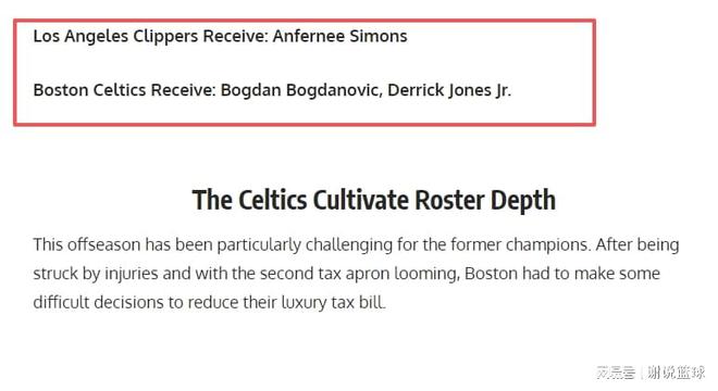 现在NBA各队整体实力接近,自从2018年以来,从未有球队完成卫冕,甚至连续两年打进总决赛,这种情况都没有出现过。当然快船就很尴尬了,引进伦纳德已经过去6年,尽管薪资总额冠绝全联盟,可快船甚至都没有从西部突围过,这么多钱算是白花了。 媒体FW也没闲着,趁常规赛还没有开始,他们策划快船可以跟绿军交易。从具体方案来看的话,快船可以抄底双能卫安芬尼-西蒙斯,而两名替补轮换博格丹-博格达诺维奇和小德里克-琼斯,由于新赛季戏份减少,可能就会被快船抛弃了。 安芬尼-西蒙斯生涯初期,一直在开拓者效力,甚至被当成利拉德接班人培养。然而在今年夏天,安芬尼-西蒙斯迎来巨变,他被开拓者贱卖到凯尔特人,要知道“假日哥”朱-霍乐迪是典型负资产,却跟安芬尼-西蒙斯互换东家,这就显得非常讽刺了。要知道安芬尼-西蒙斯上赛季,场均还能拿到19.3分4.8次助攻,是开拓者外线强点。而安芬尼-西蒙斯被送到凯尔特人后,发现自己更加尴尬,因为绿军也没准备留下他,似乎希望做二次销售。那么如果安芬尼-西蒙斯再次离队,快船算不错的新下家,虽然阵容极具厚度,但稳定的得分手却不多,更何况快船年龄结构偏老,急需要新鲜血液后备力量,而安芬尼-西蒙斯恰好就满足这些条件。 至于快船两名球员,起码都不算非卖品,博格丹-博格达诺维奇季后赛,整体表现就严重下滑,防守端更是屡遭针对。结果在今年夏天,他代表塞尔维亚出战男篮欧洲杯,这原本值得赞许,结果在小组赛期间,博格丹-博格达诺维奇就腿筋拉伤,提前退出了这届比赛,塞尔维亚也很早出局。虽然等到赛季开始,博格丹-博格达诺维奇能够登场,可这种伤病非常麻烦,作为队友的保罗和哈登就是例子,状态暴跌可能只要一瞬间。 德里克-琼斯去年夏天,作为自由球员转投快船,他个人表现其实很不错。然而新赛季他失去先发位置,如果作为防守工兵,似乎显得有些奢侈。小琼斯进攻手段,其实还是非常单一的,如果没办法吃饼,只剩下空位三分这一点,而且还不算稳定,这也让他成为快船最具价值筹码之一。 |