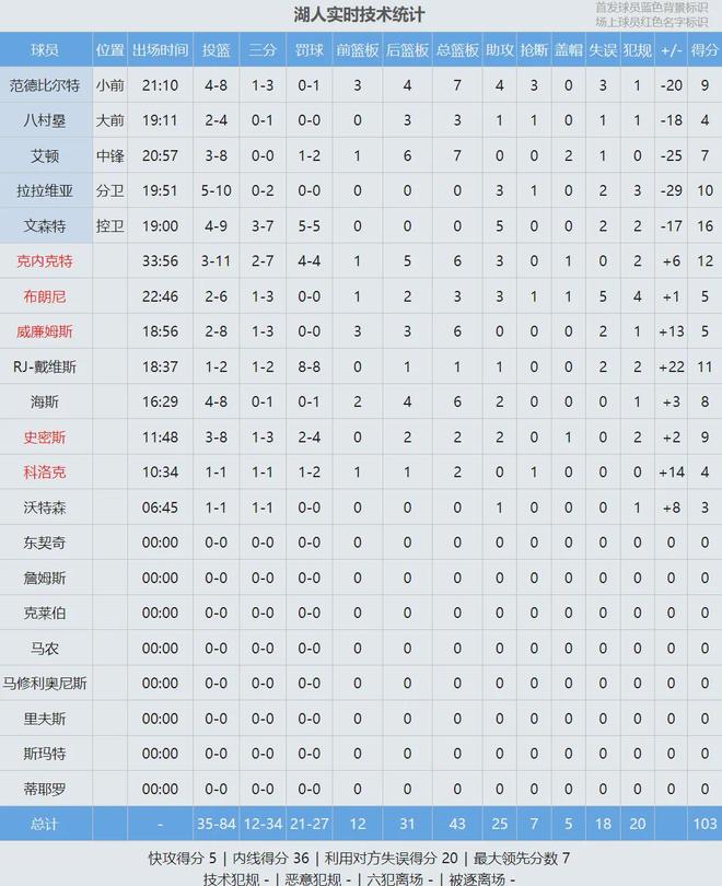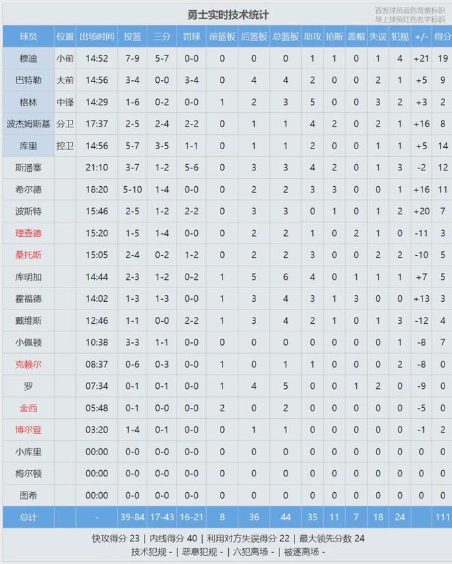 北京时间10月6日,NBA季前赛:勇士主场vs湖人。这是勇士首场季前赛,同时也是湖人的第二场季前赛。此役湖人6名球员缺阵:东契奇、詹姆斯、里夫斯、斯玛特、蒂耶罗、克莱伯。勇士主力可以出战,但是只打上半场比赛。 湖人首发:文森特、拉拉维亚、范德比尔特、八村塁、艾顿。勇士首发:库里、波杰姆斯基、穆迪、巴特勒、追梦格林。老将霍福德今日替补出战,不过常规赛开始后,霍福德会打首发。梅尔顿还在养伤,他跟赛斯-库里今天不打。 艾顿上一场2中0仅得1分,布朗尼12中1依靠罚球拿到8分,今天他俩急需找回手感。艾顿首节6中3得到7分,状态回暖。霍福德一上场就有贡献,秒传库里打成2+1!库里开启日天模式,单节5投4中砍下11分,勇士一度领先到两位数。 文森特站出来率领湖人追分,首节打完,勇士32-31仅领先1分。文森特3投2中,罚球5中5,单节砍下10分4助攻。第二节开始,勇士主力依然留在场上。文森特连得6分帮助湖人反超。追梦和范德彪发生小摩擦,不过裁判并未吹罚。 艾顿进攻端有点黄油手,不过面对勇士五小阵容时,艾顿在防守端展现了威慑力,多次干扰追梦和巴特勒的上篮。科尔同时换上霍福德和波斯特,增加内线高度。上一场10中2的克内克特,今天上半场手感回暖,湖人长时间保持微弱的领先。 上半场最后1分钟,霍福德和穆迪连中三分,勇士再次领先。半场战罢,勇士62-55。霍福德3投1中拿到3分4板3助3帽,正负值+13全场第二高。库里14分2助、穆迪13分、巴特勒9分4板。文森特狂轰16分4助、艾顿7分7板2帽。 第三节勇士替补轰出12-2的攻击波,分差很快来到15分以上。湖人防守松懈,勇士半节飙进6记三分。湖人主力打了一会儿也下场休息,两队换上纯替补阵容。布朗尼成为场上焦点,但他的表现让人失望,前三节4中1仅得3分4失误。 三节打完,勇士102-80领先22分。穆迪已经砍下19分,库明加5分6篮板4助攻,第四节连他俩也休息了。毕竟是季前赛,大多数球队在考察阵容,双向合同跟训练营合同球员都有上场机会。湖人上一场输了22分,看看今天输多少。 波斯特在第四节浪费不少机会,科尔将其换下。布朗尼贡献一记单手补扣,詹姆斯站起来欢呼,最后2分钟湖人追到个位数。全场结束,勇士111-103战胜湖人,拿到季前赛开门红,湖人遭遇2连败。勇士三分43中17,命中率39.5%! 霍福德跟球队无缝衔接,这才是勇士最开心的事情。最后看看数据,说说你的感受: |