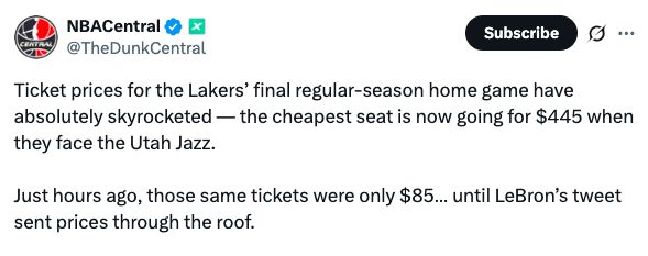 詹姆斯发布决定动态,湖人收官战最低票价85涨到