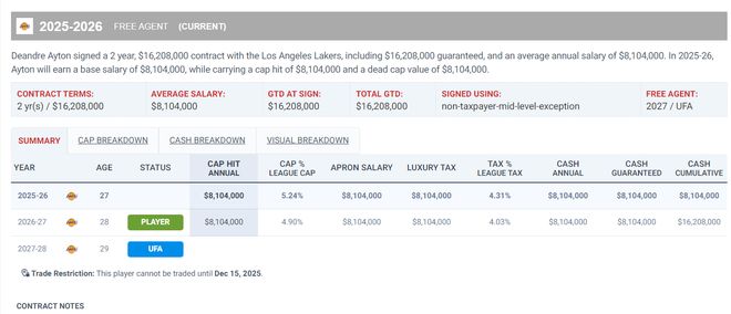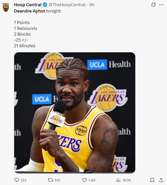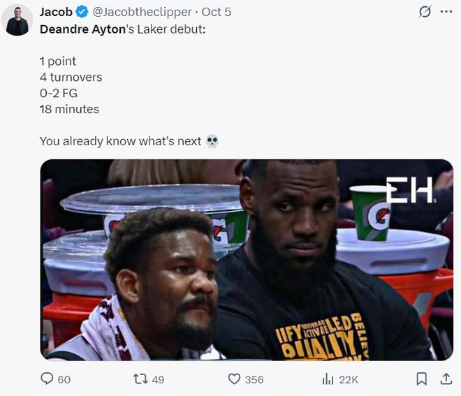 湖人季前赛遭遇二连败,先是不敌太阳随后不敌勇士,没有东契奇、詹姆斯的湖人毫无竞争力可言,休赛期吹了几个月的新援艾顿、拉拉维亚并没有展现出过人的表现,如今湖蜜只能期待斯玛特与蒂耶罗了。 对阵勇士一战科尔使用了一套死亡五矮先发,库里1.91米、波杰姆斯基1.93米、穆迪1.96米、巴特勒2.01米、追梦1.98米,平均身高不足1.96米,要知道艾顿2.13米的身高+2.17米的臂展,在首节面对这套死亡五矮,他只拿到7分3篮板1盖帽。 第二节勇士走马换将让39岁身高2.08米的霍福德上来,结果艾顿面对老头伙夫1中0没得分拿到4篮板1盖帽,艾顿才27岁啊,感觉他连39岁的霍福德都追不上,艾顿作为昔日状元也太软了。 全场比赛21分钟,8中3,拿到7分7篮板2盖帽1失误,正负值-25,命中率37.5%,就面对勇士这套矮子阵容命中率都可以不过50%令人无奈。 上一场他对阵太阳,17分钟里2中0,拿1分8篮板1助攻1抢断2盖帽4失误,作为一个7尺中锋打季前赛两战10中3,命中率30%,这算什么优质引援呢? 湖人今夏是以两年1620万的合同签下他,这份合同下赛季薪水为810万,26-27赛季是810万,这份合同没有球队选项与球员选项,可全额保障,一开始都觉得湖人低价签下27岁的前状元艾顿赢麻了,可当艾顿登场才知道,他跟联盟顶级的内线差距有多大。 艾顿在采访中解释自己表现不佳的原因:我到这里来是为了完成教练组交待的任务,我并不看重个人数据,我们的目标是去赢得比赛。 顿宝这个甩锅堪称绝美,下一场季前赛东契奇大概率会打,常规赛阶段勒布朗肯定也会打,詹东双皇真的可以拯救他吗?艾顿今夏跟开拓者买断时牺牲了3550万薪水中的1000万,他转投湖人两年合同如果拉胯到底,那么他可能就要沦为底薪了。 |