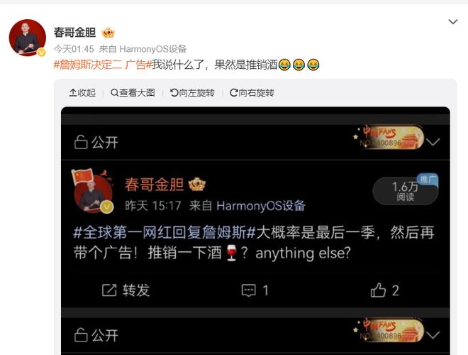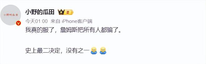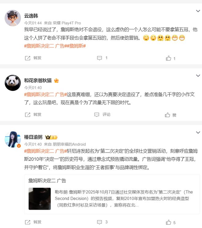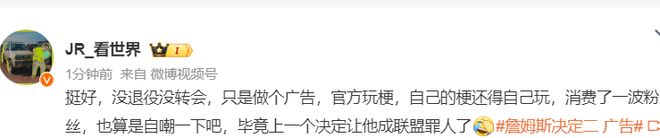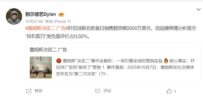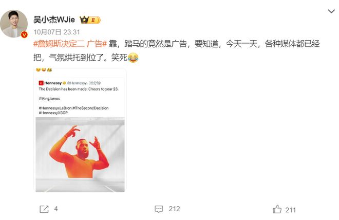 北京时间10月7日晚,勒布朗-詹姆斯在个人社媒提前公布决定二,他将与轩尼诗合作,推出联名限定款"勒布朗-詹姆斯臻选V.S.O.P干邑"。 "非常荣幸能延续与轩尼诗的这段合作,"詹姆斯在新闻稿中表示,"瓶身设计融入了我的经典庆祝动作,这对我而言意义非凡——它象征着欢庆与联结,也正是这款产品设计的初衷。" 勒布朗-詹姆斯的决定一,那是在2010年夏他将天赋带到迈阿密,那也是他职业生涯第一次转会,当时是先签后换去的热火,随后他在热火拿到了两个冠军。可这个决定二却只是打广告,预热了一天就迎来这个消息? 【诸多媒体、大V、名嘴都在等待勒布朗这个决定二,因为今夏他没有跟湖人达成续约,不少人预测勒布朗可能是要决定明夏退役开启退役巡演,这导致湖人常规赛最后一场的球票从85美元上涨到400多美元,结果勒布朗决定二只是个广告,这谁受得了】 别说国外勒布朗这个决定二登上热搜被骂惨,就是在国内他也登上了热搜第二,勒布朗一样被骂惨了。 1.真的服了,勒布朗骗了所有人,史上最2的决定没有之一 。 2.靠,竟然是个广告,要知道所有媒体都已经等着,气氛烘托到这了,笑死。 3.官方玩梗,勒布朗自己的梗也玩,消费粉丝也算自嘲一下,毕竟决定一让他成为联盟罪人。 4.又把巴斯当猴耍了; 5.这一波品牌是赚还是亏啊?感觉大家会抵制骗子代言人的酒。 6.不是退役就挺好的,老詹是懂流量的; 7.轩尼诗联名款首日销售额突破2000万美元,但品牌舆情分析显示投机取巧类负面评论占比32%; 8.有人预测勒布朗要说是最后一季然后推销酒。(结果只是推销酒) 9.真难绷啊,勒布朗为了流量也没有下限了; 10.勒布朗使劲营销,算自黑一下了; 太多人对勒布朗这一波操作进行了批判,因为决定一和决定二完完全全是两个概念的问题,是纯属搞流量。 |