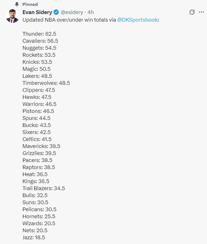 雷霆队是24-25赛季的NBA总冠军,休赛期他们接连续约了杰伦-威廉姆斯、谢伊-亚历山大、切特-霍姆格伦等核心,25-26赛季他们必然夺冠第一热门,雷霆的卫冕呼声很高,此前BR预测雷霆下赛季的战绩是62胜20负。 北京时间10月8日,美媒DKSportsbook预测了联盟30支球队的战绩情况: 1.雷霆62.5胜、2.骑士56.5胜、3.掘金54.5胜、4.火箭53.5胜、5.尼克斯53.5胜; 6.魔术50.5胜、7.湖人48.5胜、8.森林狼48.5胜、9.快船47.5胜、10.老鹰47.5胜; 11.勇士46.5胜、12.活塞46.5胜、13.马刺44.5胜、14.雄鹿43.5胜、15.费城42.5胜; 16.绿凯41.5胜、17.独行侠39.5胜、18.灰熊39.5胜、19.步行者38.5胜、20.猛龙38.5胜; 21.热火36.5胜、22.国王36.5胜、23.开拓者34.5胜、24.公牛32.5胜、25.太阳30.5胜; 26.鹈鹕30.5胜、27.黄蜂25.5胜、28.奇才20.5胜、29.篮网20.5胜、30.爵士18.5胜。 上赛季雷霆是68胜,上赛季骑士是64胜两队均有下滑,绿凯上赛季是61胜但因为塔图姆的伤病问题暴跌合理,上赛季火箭52胜,新赛季上升到53.5胜,感觉上升并不明显。 湖人上赛季是50胜,新赛季还下滑了?勒布朗-詹姆斯、东契奇、里夫斯的三巨头组合统治力开始下滑吗?很多人觉得东契奇新赛季是MVP,如果东契奇是MVP只拿48.5胜是不是太少? 斯蒂芬-库里豪言勇士要夺冠,但美媒预测勇士只有46.5胜,上赛季的他们是48胜。当然,这份预测战绩比上赛季的整体均有下滑,比如勇士这个46.5胜在西部已经是第七。 |