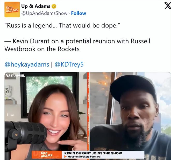 北京时间10月9日,火箭球星凯文-杜兰特表示,拉塞尔-威斯布鲁克“理应”留在NBA,且若两人能在火箭重聚,会是“很棒”的事。 在凯-亚当斯的播客节目中,杜兰特称威斯布鲁克能否加盟火箭与自己“无关”。“我完全不清楚,也没向任何人打听过(重聚的事)。这件事根本没被提上议程,而且通常这类事要是有眉目,动静都会很大,”杜兰特说,“但除了网上球迷的讨论,我没听到任何相关消息。” “拉塞尔(威斯布鲁克)是传奇,我认为他现在理应留在NBA,也该用自己想要的方式结束NBA生涯,所以没错,重聚会很棒。但这不是我能决定的,目前我会把这件事交给负责做这类决策的人。” 36岁的威斯布鲁克目前是自由球员,上赛季他在掘金队担任重要轮换角色,出战75场比赛,其中36场首发。他场均登场27分钟,能得到13.3分、6.1次助攻和4.9个篮板。他在赛季结束后拒绝执行球员选项,成为完全自由球员。 37岁的杜兰特与威斯布鲁克曾在雷霆队做过8个赛季的队友,并在2011-12赛季一同打进NBA总决赛。威斯布鲁克离开雷霆后,曾于2019年效力休斯顿火箭队,此后先后为华盛顿奇才队、洛杉矶快船队和洛杉矶湖人队效力,最终在2024年7月加盟丹佛掘金队。 前NBA球星艾弗森在最近的一次节目上也谈到威少,他认为威少是现役中最让他想起自己的球员。“他打球拼劲十足,每场比赛都像最后一场一样全力以赴。他的能量始终保持在同一水准,做任何事都付出全部努力。” 另一边,杜兰特则在今年7月从太阳队被交易至火箭队。下赛季结束后,他将成为完全自由球员。不过,杜兰特在首次官方新闻发布会上表示,自己有可能与火箭签下续约合同。 对于威斯布鲁克而言,这位曾以劲爆能量和“三双机器”式数据表现闻名的后卫,如今虽已转型为可靠的角色球员,但他在火箭获得合同的机会可能相对有限。 尽管在老将后卫范弗利特遭遇前交叉韧带撕裂后,火箭队可以获得伤病特例,但目前还没有空间签下球员。种种迹象表明,火箭会更多依赖二年级后卫谢泼德——上赛季他出战52场比赛,同时在NBA和发展联盟效力。 |