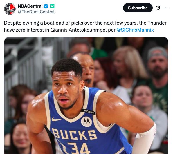 雷速体育10月9日讯 此前Shams报道,字母哥休赛期推动过球队与尼克斯的交易谈判,随后也是透露字母哥和经纪人已经在研究哪些球队有能力在交易截止日之前得到他。 据Chris Mannix报道,尽管雷霆拥有未来几年的大量选秀权,但他们对字母哥毫无兴趣。 雷霆在上赛季夺得了总冠军,今夏与队内核心组合亚历山大、杰伦·威廉姆斯和霍姆格伦达成提前续约合同,保留了核心阵容。 |