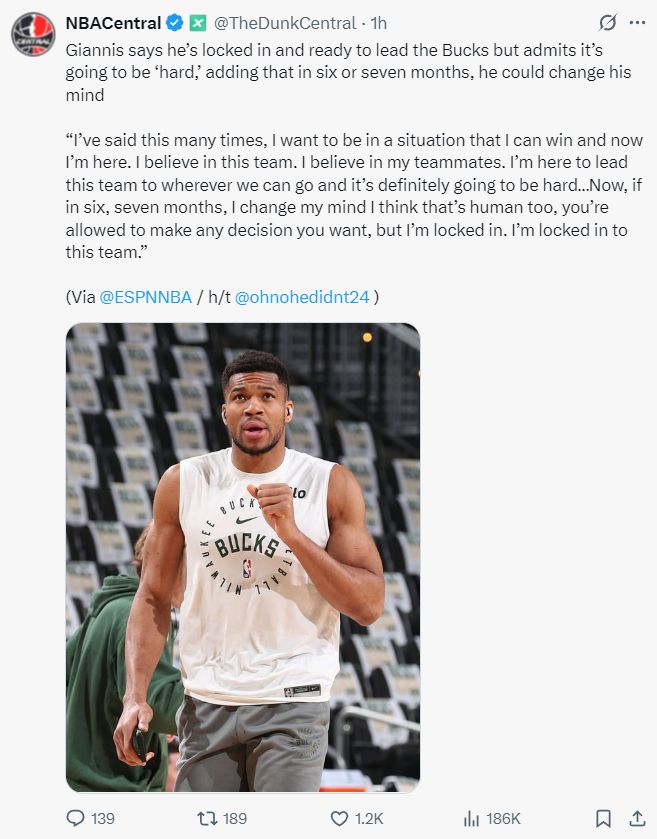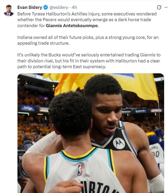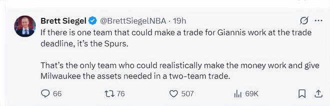 北京时间10月9日,美国媒体NBA Central转发了扬尼斯接受ESPN专访的片段,字母哥在采访中回应了交易流言的一些细节,我目前专注于雄鹿,如果6-7个月后我改变主意也是人之常情。 扬尼斯详细的言论是:我已经谈过很多次交易流言这个话题,我希望自己处在一支能竞争总冠军的球队中,现在我在雄鹿打球,我相信我们的球队与队友,我会带领这支球队冲击总冠军虽然这很艰难。 随后字母哥话锋一转:当然,如果6-7个月后我改变了主意,我认为这也是人之常情,因为我有权做出我觉得对的事情,可我现在是专注于雄鹿,全身心的投入在雄鹿这支球队中。 两天之前,ESPN记者Shams透露,今夏尼克斯与雄鹿商议过扬尼斯的交易,而扬尼斯本人最想去的球队就是尼克斯,只可惜尼克斯能付出的资产有限谈判破裂。 10月8日有媒体透露扬尼斯的妻子已经和他的孩子永久搬迁到希腊,而全美只有纽约存在直达希腊的航班。(此前扬尼斯的妻子与孩子都是居住在密尔沃基) 美记Vivek Jacob写道:从扬尼斯的言论来看,他身位雄鹿球员的生涯正在进入倒计时,无论是交易截止日、明年夏天还有2027年夏天,总之他将离开密尔沃基。 根据美记Brett Siegel说法,如果本赛季有球队可以负担扬尼斯的交易资产,那么就是马刺队,马刺是唯一可以满足雄鹿所需要求的球队。(因为此前雷霆记者已经明确表态,虽然手握多个首轮签但对扬尼斯毫无兴趣) NBA记者埃文-斯迪瑞则透露,在哈利伯顿受伤之前,一些高管就猜测,步行者会最终成为扬尼斯交易的黑马,步行者也拥有大量选秀权同时拥有一支实力强劲的年轻阵容,这在交易中颇具吸引力。雄鹿不太可能将扬尼斯送出同区的活塞,字母哥+哈利伯顿的阵容可以让步行者成为东部长期霸主。 |