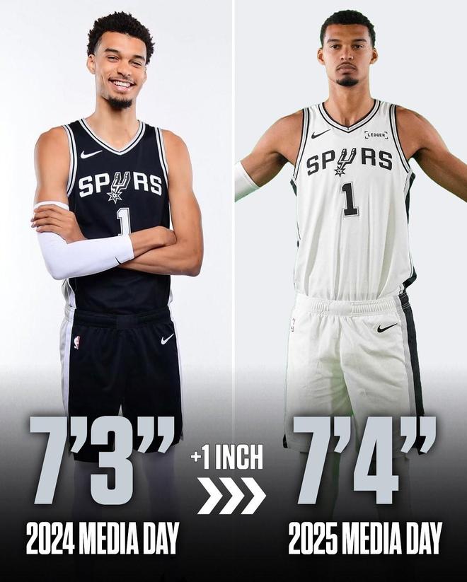北京时间10月9日,NBA官网更新了2025-26赛季球员体测数据。 其中,马刺中锋文班亚马的身高由上赛季的7英尺3英寸(221cm)涨至7英尺5英寸(226cm),相比较上赛季,长高了5cm。 此前在马刺媒体日时,有媒体报道称文班的身高为7英尺4英寸(224cm)。 |