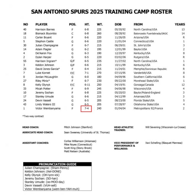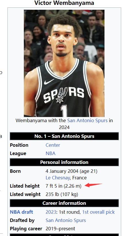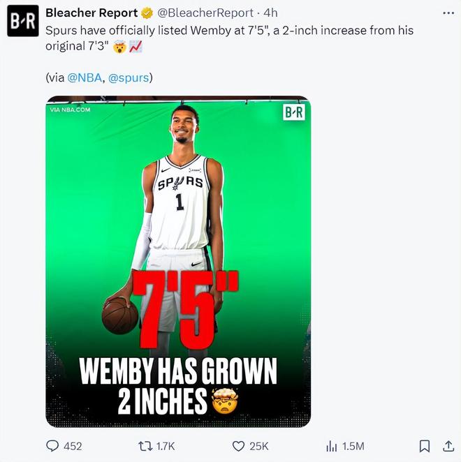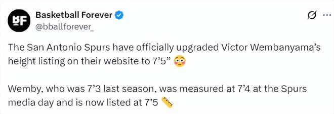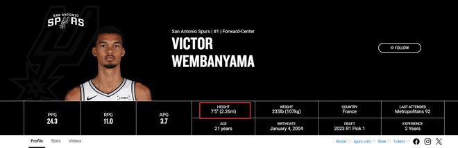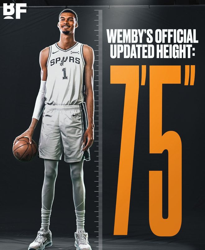 北京时间10月9日,美国媒体BR写道:马刺官方公布文班亚马身高为7尺5英寸(约2.26米),比原先的7尺3英寸(约2.21米)增加了2英寸。 就在9天之前,NBA媒体日马刺队官方公布的季前赛名单中,文班亚马的身高还是7尺4寸,体重240磅,短短9天文班亚马就从7尺4长到7尺5?9天长了2厘米,这你们觉得可能吗? 当时马刺媒体的重点是,文班亚马新秀体重210磅,在NBA锤炼一年后增肌到240磅,增加了30磅(约13.6公斤)肌肉的文班亚马对抗性大大提升,他的身高也已经达到7尺4(约2.24米)比新秀赛季长高了3厘米左右。 根据美媒BF的消息,马刺队官方网站上文班亚马的身高数据已经更新为7尺5寸!上赛季文班亚马的身高是7尺3,在马刺媒体日的身高测量是7尺4,如今他的身高被更新为7尺5。(美媒发表了一个目瞪口呆的表情) 我刚刚真的去看了NBA官网,文班亚马的身高的确已经更新为7尺5(2.26米),他已经是跟姚明一样身高的超级长人了,不过他的体重是235磅(约107公斤),这比马刺媒体日给出的240磅少了5磅。 维基百科上文班亚马的身高数据也已经更新为7尺5(2.26米),体重为235磅(107公斤),看起来文班亚马是真的又长高了。 今夏文班亚马接受了加内特、奥拉朱旺的训练,他又在中国少林寺进行了特训,新赛季的他很有可能要开始统治联盟,大家就拭目以待吧,2.26米的长人有顶级的运动能力与静态天赋,对手太难了。 |