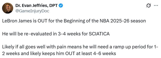 北京时间10月10日,据名记Shams报道,湖人球星詹姆斯因右侧坐骨神经痛,将至少休战3至4周。这意味着他将缺席2025-26赛季的赛季初段比赛,预计无缘对勇士的揭幕战。这将是詹姆斯职业生涯中首次缺席赛季揭幕战。 40岁的詹姆斯已缺席湖人队前两场季前赛,且尚未参加一次完整的训练。湖人队主教练雷迪克此前将其伤情描述为“臀部神经刺激”。ESPN记者Matt Barrie在报道时调侃了老詹: “我倒有个主意,或许他往伤处抹点轩尼诗,一切就都好了。”此前,詹姆斯以“决定2”的方式宣布与轩尼诗推出联名干邑,遭到不少嘲讽。 即将开启个人NBA历史第23个赛季的詹姆斯,将因这次伤病,被迫缺席球队的新赛季开局的比赛。湖人队表示,未来3至4周内不会对他的伤情进行重新评估。 美媒表示,坐骨神经痛的症状是疼痛起源于脊柱,并向下放射至腿后,其症状表现为疼痛、无力,有时还会出现麻木感,通常由坐骨神经受损或受伤引起。医学专家表示詹姆斯预计还需要1至2周的恢复训练期,这可能会让他最终至少缺席4至6周。 尽管湖人队在整个季前赛期间对这位老将球星一直持谨慎态度,但球队原本期望且希望他能做好准备,参加10月22日对阵金州勇士队的新赛季揭幕战。遗憾的是,詹姆斯不仅会错过球队所有季前热身赛,他新赛季的首秀最早也要等到11月初。 在湖人今日训练后被问及这位球星的恢复状况时,主教练雷迪克先是犹豫了一下,随后表示詹姆斯“有他自己的时间表”。这位湖人队主帅并未给出詹姆斯何时会开始增加篮球训练强度的具体时间。 在整个季前赛期间,湖人队关于詹姆斯的态度一直很明确:他们不会让他在2025-26赛季初面临受伤或疲劳的风险,在安排他的训练和比赛负荷时,球队会始终保持谨慎。 在詹姆斯缺阵期间,东契奇将成为湖人队场上唯一的核心球星。除东契奇外,里夫斯将承担起球队新赛季初期的重任。 雷迪克还将启用球队新援斯马特、艾顿和拉拉维亚,在詹姆斯无法出战的情况下,让他们在攻防两端为球队提供额外的火力支持。值得注意的是,出于谨慎的考虑,东契奇和斯马特目前也没有参加季前赛。 上赛季,詹姆斯继续证明自己是NBA最出色的球员之一。他共出战70场比赛,场均得到24.4分、8.2次助攻和7.8个篮板,投篮命中率达到51.3%。湖人队将于10月底公布詹姆斯伤情的进一步更新。 |