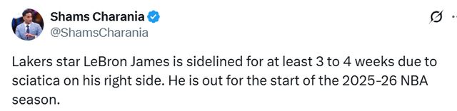 首次无缘揭幕战!詹姆斯因坐骨神经痛缺席3-4周
