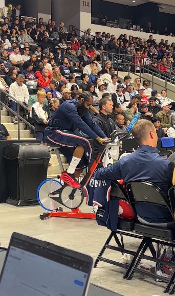 非常认真!比赛期间哈登在场边进行完整的单车