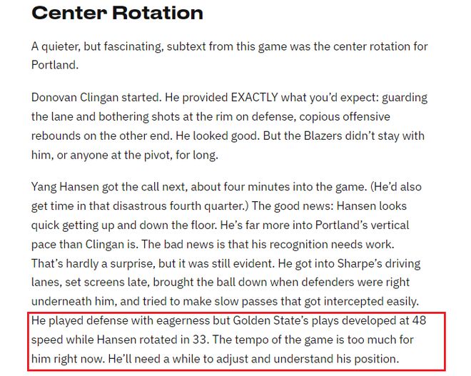 杨瀚森在首场季前赛表现不佳,他出战21分钟,5投2中,得到4分4篮板1助攻,出现4次失误和6次犯规。开拓者跟队记者戴夫·戴卡德撰文解析了开拓者的首场季前赛,其中包括中锋轮换的片段,他指出杨瀚森跑动速度其实并不慢,但是他的意识偏慢,也就是他的场上意识暂时还跟不上快节奏的NBA比赛。 对阵勇士的比赛,多诺万·克林根首发出场。他的表现完全符合你的预期:镇守禁区,在篮筐附近很好地影响对手的投篮,防守端则抢下大量进攻篮板。他表现不错。但开拓者队并没有让他或任何一位中锋长期留在场上。 杨瀚森在比赛进行了大约四分钟左右替换上场。(在那灾难性的第四节,他也获得了上场时间。)好消息是:瀚森看起来跑动迅速。他比克林根更适应开拓者的节奏。坏消息是,他的防守意识还有待提高。这并不令人意外,但仍然显而易见。他在夏普的突破路线上设置掩护总是慢一拍,带球时被防守球员紧紧跟随。他尝试进行传球,速度偏慢但很容易被拦截。他防守时很积极,但勇士队的进攻节奏以48的速率展开,瀚森则以33的速率轮换。现在的比赛节奏对他来说太快了。他需要一段时间来调整和理解自己的位置。 瀚森在21分钟的比赛中犯满离场。他当晚最惨痛的数据是这段时间的4个篮板。相比之下,阿夫迪亚出战19分钟多一点就抢下了8个篮板。 开拓者队也派出了杜普·里斯和其他一些没有真正中锋的阵容。后者的组合速度确实很快。紧逼和转换进攻是球队的标签,打得赏心悦目。不幸的是,在这段时间里,篮筐保护和篮板严重缺失了。面对年龄更大、速度更慢的勇士队,这并没有造成太大的影响。这看起来更像是一种选择性策略,而不是真正的解决方案。 对于杨瀚森来说,他需要尽快适应NBA的快节奏,因为这段时间罗威还在养伤,他可以有比较稳定的出场时间。一旦罗威复出,如果杨瀚森还没适应NBA的节奏,那么他的上场时间会大幅缩减。但如果他适应了NBA的节奏,那么即便罗威复出,杨瀚森也有望获得不少出场时间。 |