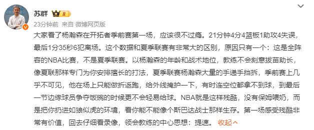 北京时间10月9日,NBA季前赛123-129不敌勇士,替补出战21分钟,5投2中、三分2中0拿到4分4篮板1助攻,出现4次失误6次犯规,末节犯满毕业略显无奈。 在开拓者被勇士逆转的比赛中,杨瀚森上半场替补登场10分钟,仅仅出手一次,错失空位三分,因此上半场没有得分进账;下半场,杨瀚森第三节终于得分,打进首球后释怀大笑,之后补篮得分,可末节杨瀚森在场上不仅没有得分进账,而且单节吃到4次犯规,累计6犯毕业,只能无奈下场。 杨瀚森季前赛首秀引热议,国内评论员苏群写道:大家看了杨瀚森在开拓者季前赛第一场,应该很不过瘾。21分钟4分4篮板1助攻4失误,最后1分35秒6犯离场。这个数据和夏季联赛有非常大的区别,原因只有一个:这是全阵容的NBA比赛,不是夏季联赛。以杨瀚森的年龄和战术地位,教练不会刻意拔苗助长,像夏联那样专门为你安排擅长的打法,夏季联赛杨瀚森大量的手递手挡拆,季前赛上几乎不可见,他在场上只能做折返跑,给外线掩护一下,有时连空位都拿不到球,到最后一节边缘球员争夺饭碗的时候更不会轻易给球。NBA就是这样残酷,没有保姆喂奶,而是把你扔进如狼似虎的环境,看你能不能像个斯巴达战士那样生存。第一场感受残酷非常有价值,回去仔细看录像,领会教练的中心思想:提速。 |