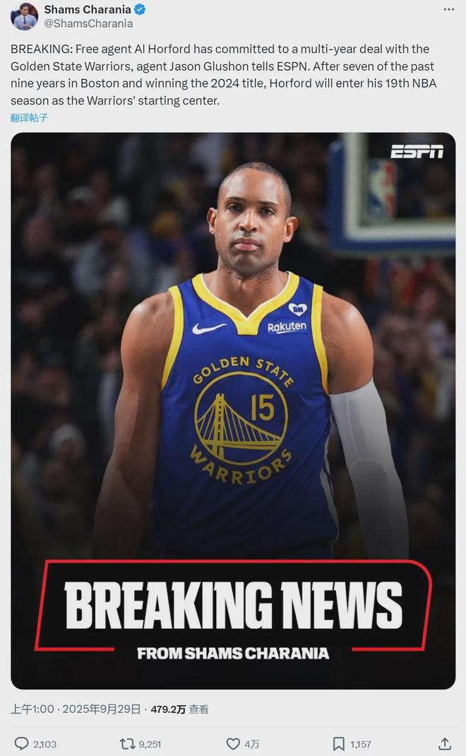 所有人的耐心都是有限的,不可能无底线地等待,实在谈不拢,可以走啊。 今天勇士做出了决定,他们的态度正在变得愈发坚定和强硬,就这样吧。 据Shams报道,今天经纪人杰森·格鲁森给出了确定消息,勇士已经跟老将霍福德签下了一份多年合同,正式加盟勇士。 巴特勒目前在圣迭戈牵头组织了一个迷你训练营,而霍福德现身参加合练。 与此同时,霍福德也是发文告别凯尔特人:波士顿的球迷像对待家人一样接纳了我,这一篇章永远在我的职业生涯中占据特殊位置,我永远珍视与这座城市一起夺得的第18冠,谢谢你,波士顿! 根据此前的消息,霍福德会成为勇士的首发中锋,这样一来这支球队的首发里居然有4名球员超过35岁,分别是35岁的追梦格林、36岁的巴特勒、37岁的库里和39岁的霍福德。 为什么霍福德不是38岁?真是逼死强迫症。 这4名首发球员合计147岁,平均年龄是36.75岁。 今天出了霍福德,勇士还确定了另外4名球员的签约。 小加里·佩顿和梅尔顿都再次确认,他们会跟勇士签约,而且今年的次轮总第56号新秀威尔·理查德也确定跟勇士签约4年,其中有2年是全额保障的。 而在最后,Shams还有跟进报道,勇士用一份双向合同签下了今年的次轮第52号新秀图希。 一天之内连续确定签下5名球员,勇士就像是临近开学在赶作业的小学生。 那么库明加怎么办呢? 库明加是一切的源头,正因为他的不肯签约,勇士迟迟没有确定一系列的引援,在今天之前都只有9名球员在球员名单中,甚至被吐槽“队内训练都凑不齐5V5的球员人数”。 今天勇士有了最后的强硬:他们绝对不会给库明加一份高额合同。 据报道,勇士目前还有2200万美元的薪资空间可以留给库明加,同时还能签下第15名球员。 根据Shams的报道,勇士目前有3份报价给到库明加:2年4500万美元或者3年7520万美元,但都在第三年拥有球队选项。 最后一份是3年5400万美元,可以不包含球队选项。 库明加纠结的点,就是不能在合同里包含球队选项,而且想要大合同。 双方谈崩的点就在这里。 还是Shmas的消息,勇士坚决不肯加入球员选项,他们跟太阳或者国王的签换谈判也没有任何进展,基本上都谈崩了。 目前库明加唯一的谈判筹码就是那一份1年800万美元的资质报价合同,这份合同将于9月30日晚上23点59分到期,要是选择接受,那么就会放弃下赛季额外的1530万美元,但可以确保他在2026年夏天成为完全自由球员。 也就是说,库明加最后的一击,就是低价在勇士再打一年,随后恢复自由身。 其实事情闹到这一步,已经没有什么缓和的余地,各方面都做了努力,甚至巴特勒和追梦格林都去联系了库明加,也跟球队管理层商议,尝试去做中间人,但没有任何效果。 库明加目前并没有前往旧金山,他也不会出席勇士的新赛季媒体日活动。 NBA这样发展了这么多年的商业联盟,也会出现这种球队和球员僵持到极致的情况,说明天下熙熙,皆为利来,谁也别说谁啊。 勇士球迷应该可以放下心了,最迟10月1日,关于库明加的一切都可以见分晓。 顺便,等库明加的事情确定,塞斯·库里就可以签约了,他就是勇士的第15名球员。 |