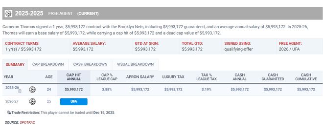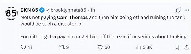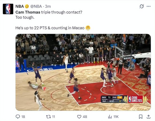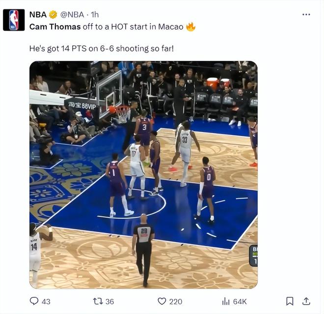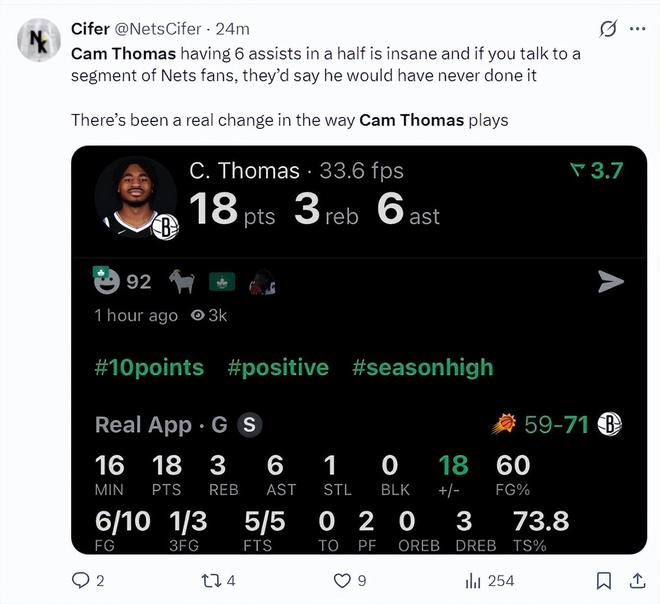 北京时间10月10日,NBA中国赛,篮网VS太阳,这场比赛是中国球员曾凡博的篮网首秀,但主角却是卡姆-托马斯,小火车这场比赛开场一波6中6连拿14分引来惊呼连连,三节打卡22分6助攻3篮板十分出彩。 托马斯首节6中6,三分1中1,罚球1中1拿到14分1篮板1助攻1抢断,NBA官方都发推为他打Call,首节他帮助篮网打出39-29的高潮。 上半场打完托马斯已经18分6助攻3篮板,网媒写道:托马斯真的实现了令人惊讶的进步,他太让人惊喜了。 网媒:托马斯半场送出6次助攻这简直不可思议,如果你跟篮网球迷交流一下就知道这不是他的打球方式,没想到托马斯的打球方式发生了巨大的改变。 第三节托马斯还完成了一个3+1,单节2中1+三分1中1+罚球1中1拿到4分,三节打完托马斯24分钟,12中7,三分4中2,罚球6中6,拿到22分6助攻3篮板1抢断,命中率58.3%,三分命中率50%,真实命中率75.1%。 就连太阳媒体都写道:我一大早起来就看到托马斯来烹饪我们了? 托马斯今夏只跟篮网签下了一份一年599万的资质报价,他一开始是索要均薪3000万的合同,后来让步索要均薪2400万的合同,可篮网总经理肖恩-马克斯都没有给,最终托马斯不得不选择了资质报价。 实际上托马斯24-25赛季场均31.2分钟,拿到24分3.8助攻3.3篮板0.6抢断0.1盖帽,命中率43.8%,三分命中率34.9%,他这个数据只获得一年599万实在是说不过去,而且这个首秀说明他不是不能打一号位,进攻型一号位现在很吃香。 网媒希望篮网可以给托马斯应有的合同,因为他的表现不该只拿低廉的合同,除非篮网其他的打算。 |