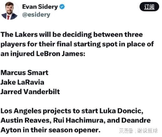显然詹姆斯的受伤,并且预计缺席开局阶段比赛,无论对于湖人还是球迷来说,都显得有些猝不及防。毕竟常规赛就要开始,詹姆斯虽然年事已高,但依旧具备全明星级别实力,此番他的缺阵对于湖人,无论整体战力还是磨合方面,恐怕都要造成影响。 如今即便詹姆斯受伤,湖人先发阵容还是确定四席,包括东契奇、里夫斯、八村塁再加上艾顿。至于第五个名额,就是三选一的状态,斯玛特、范德比尔特以及拉拉维亚,都有可能进入先发阵容。 斯玛特今年夏天被奇才买断,之后接受东契奇的招募,成为湖人阵中一员。巅峰时期的斯玛特,可能就像弱化版霍乐迪,虽然进攻端神经刀,外线投射很不稳定,组织传控在后卫里也一般,但防守真的强悍,甚至拿到过DPOY奖项。斯玛特最大问题,就是这两年遭遇伤病侵袭,甚至职业态度都受到质疑,所以斯玛特能恢复几成状态,对于湖人至关重要,也直接决定他出场时间,包括能否竞争先发位置。 范德比尔特这几年,其实都在湖人效力,但他情况跟斯玛特有点类似,那就是同样受伤病所困,而且在球场上防守强于进攻,因为实在没射程,甚至显得拖空间。其实在季前赛前两场期间,湖人就曾经变阵,让范德比尔特回到先发阵容,算是有了一些默契度和化学反应。范德比尔特在场上,确实可以弥补东契奇和里夫斯的防守软肋,但问题也显而易见,那就是他进攻着实没谱,尤其在三分线外,可能会被对手直接放空。 相反今年夏天刚加盟湖人的前锋杰克-拉拉维亚,或许会成为这场竞争的黑马,作为2022年首轮秀,拉拉维亚在灰熊表现不佳,直到上赛季后半段被送去国王,他才得到更多的表现机会。数据上拉拉维亚场均拿到6.1分2.8个篮板1.3次助攻,其实也没有特别突出,但他展现了作为优质3D球员潜质。而且拉拉维亚未满24周岁,换言之后面几年,他有可能在湖人,度过自己的生涯巅峰期,那必然会受到重用。 |