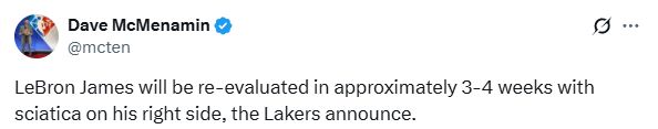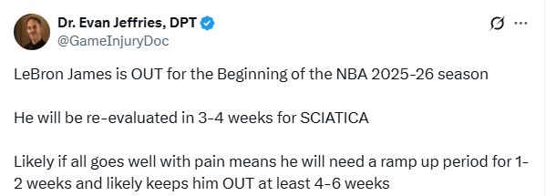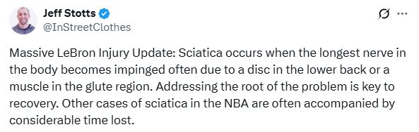 北京时间10月10日,据湖人随队记者Dave McMenamin报道,湖人官方已经宣布,詹姆斯因右侧坐骨神经痛将再休战3-4周,将缺席新赛季的开局阶段,这意味着他将生涯首次缺席常规赛揭幕战,此前他已经连续22次参加揭幕战。 自从新赛季媒体日至今,詹姆斯因伤仅仅进行个人训练,一直没有参加球队的完整训练,而且此前已经缺席了两场季前赛;由于遭遇坐骨神经痛,他不仅缺席全部的季前赛,而且将缺席新赛季初期的比赛,坐骨神经痛是指疼痛从脊柱发出并沿腿部后侧放射的症状。 距离新赛季开打还有12天,詹姆斯因伤至少再休战3-4周,这意味着他将缺席新赛季1-2周的比赛,按照詹姆斯缺席的时间推算,湖人这段时间预计会打5-9场比赛;湖人新赛季前10场的对手分别为:勇士(主)、森林狼(主)、国王(客)、开拓者(主)、森林狼(客)、灰熊(客)、热火(主)、开拓者(客)、马刺(主)、老鹰(客)。 对于詹姆斯的伤势恢复情况,雷迪克表示詹姆斯有他自己的恢复时间表。 医学专家Evan Jeffries表示,詹姆斯将缺席2025-26赛季初期的比赛,他将在3-4周后重新评估坐骨神经痛,如果一切顺利,疼痛可能需要1-2周的恢复期,并且可能至少需要4-6周的时间才能康复。 另一医学专家Jeff Stotts表示,勒布朗伤情重大更新:坐骨神经痛的发生是由于人体最长的神经受到压迫所致,压迫通常源于腰椎间盘或臀部肌肉问题。解决问题的根源是康复的关键。NBA中其他坐骨神经痛病例往往伴随着长期休战;NBA名宿纳什曾遭遇过这样的伤病。 |