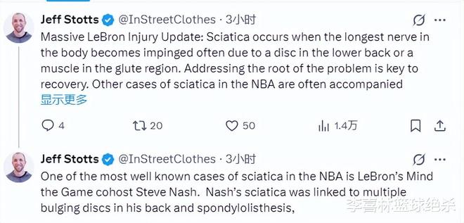 北京时间10月10日,赛季还没开始,湖人就遭遇伤病袭击,詹姆斯因为坐骨神经痛将缺席3-4周。这意味着他将缺席揭幕战和赛季初的部分比赛。而且这种伤病很难一下子完全康复,可能会继续伴随詹姆斯比较长的时间。詹姆斯的节目搭档纳什就曾经被这种伤病困扰很长时间。湖人是时候将球队战术核心完全交给东契奇了。紫金军团将在赛季初期迎来不小的考验。不过,东契奇和里夫斯都有望在詹姆斯缺阵的时候迎来爆发。 詹姆斯职业生涯首次缺席常规赛揭幕战,此前他已经连续出战22次,此前22次揭幕战场均可以得到25.2分8.1篮板5.7助攻。伤病还是追上了篮坛常青树詹姆斯,而这种伤病可能会加深詹姆斯退役的想法。 医学专家杰夫·斯托茨解析了詹姆斯的伤情,他在推特上写道:“勒布朗重伤更新:坐骨神经痛是指身体最长的神经受到压迫产生疼痛,通常是由于腰椎间盘或臀部肌肉受损所致。解决问题的根源是康复的关键。NBA中的其他坐骨神经痛的病例往往持续相当长的时间。” 杰夫·斯托茨进一步表示:“NBA中最著名的坐骨神经痛病例之一是勒布朗的《球场大脑》节目联合主持人斯蒂夫·纳什。纳什的坐骨神经痛与背部多个椎间盘突出和脊椎滑脱有关。”纳什受到这种伤病困扰很长时间,我们经常看到运动员时代的纳什在场下休息时是躺在铺了毛巾的地板上。纳什在职业生涯末期仍然患有坐骨神经痛,并且因此缺席比赛。他最终在2015年退役。 |