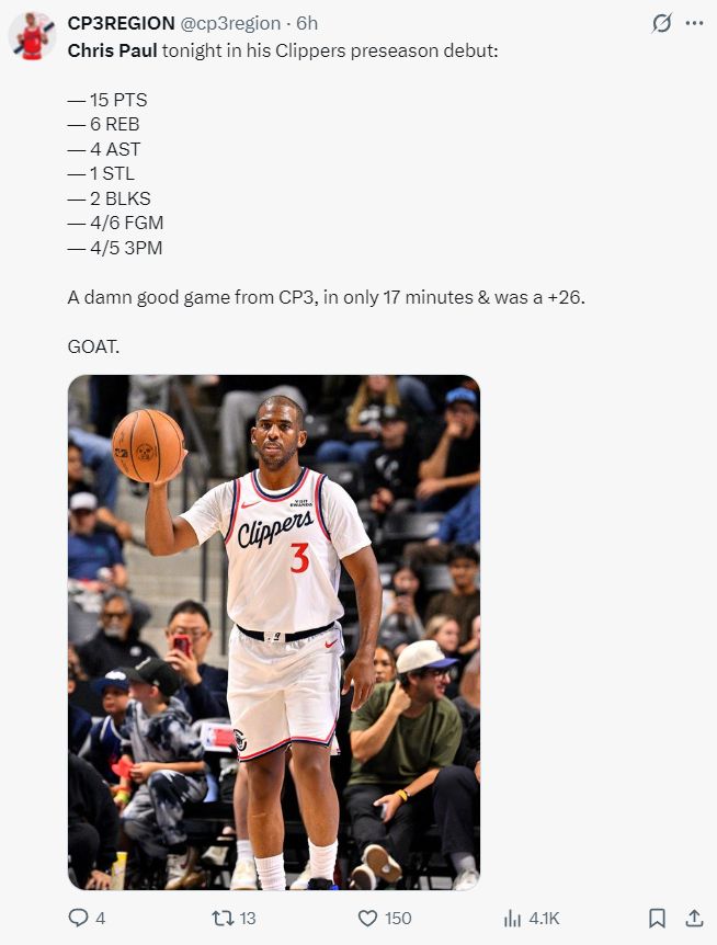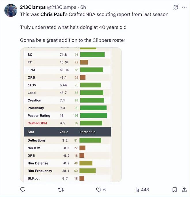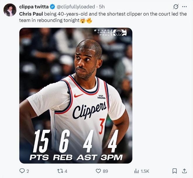 快船大胜广州,这场比赛上半场两队还打得很胶着,可第三节快船在克里斯-保罗的带领下打出42-8的攻防浪潮,保罗的发挥让快船主场球迷惊呼连连,这位40岁的老将依旧老而弥坚,保罗 单节13分3助攻直接引来一波流。 保罗此役是作为替补球员登场,他是打詹姆斯-哈登一号位上的替补,首节登场后手感并不佳,上半场保罗是2中0,拿到2分4篮板1助攻1盖帽1失误的数据。 保罗在快船主场的呼声是非常之大的,保罗在LAC有庞大的球迷基础,他是曾经空接之城的奠基人,所以首节CP3登场时球迷们都响起了山呼海啸一般的呐喊声。 第三节保罗三分4中4,罚球1中1,拿到13分3助攻2篮板1抢断1盖帽,保罗这一节更是让主场球迷沸腾,三节打完17分钟,6中4,三分5中4,拿到15分6篮板4助攻1抢断2盖帽,命中率66.7%,三分命中率80%,正负值+26,数据端攻防一体。 保罗的表现当然引发了全美热议,赛后40岁的保罗谈到这场快船首秀:这是我一直期待的事情,但你永远无法确定它是否真的发生,回到这里对于我来说意义非凡,这里是我和家人一直称之为家的地方。 快船媒体:短短17分钟拿到如此优异的数据,正负值+26,他就是GOAT。 快船媒体:保罗今年已经40岁了,他还是场上最矮小的球员,可他竟然在篮板球方面也能做出积极的贡献。 美记Shane Young:能亲眼目睹一位联盟历史前三的控球后卫,在40岁高龄还能发挥如此积极的作用,这太令人惊叹了。 保罗今夏是以一年229万的老将底薪重返快船,快船得到40岁的他赚翻了。 泰伦卢在赛后的采访中也评价了保罗在组织进攻端为球队做的贡献。 美媒:这是上赛季保罗的数据,他依旧起到正向作用,40岁的他还能有这样的表现实在是令人叹服,他会成为本赛季快船一大亮点。 |