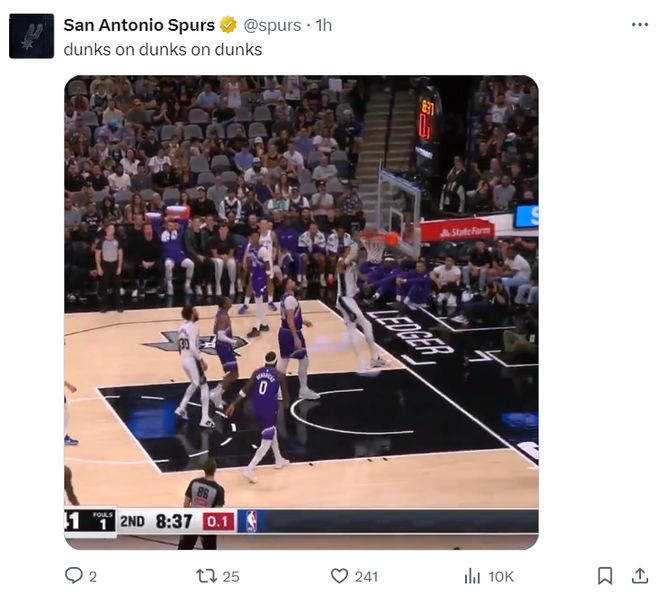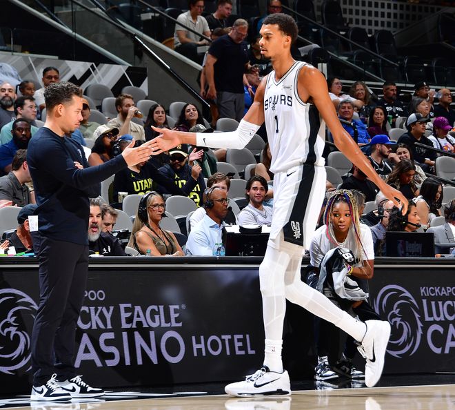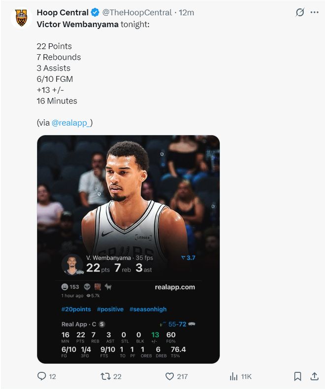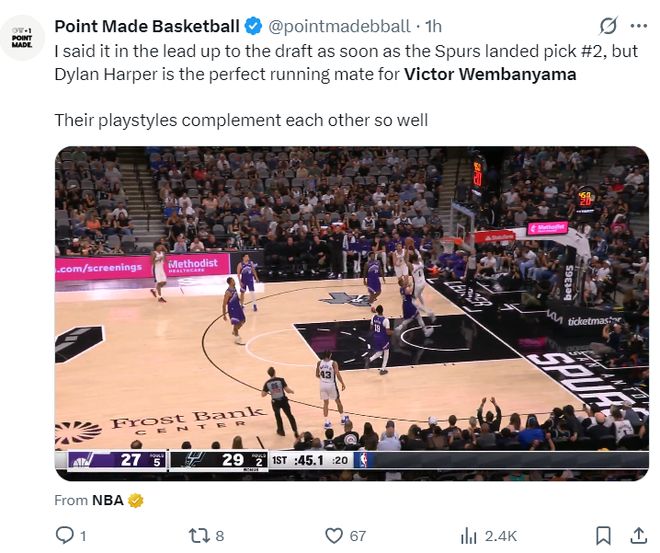 北京时间10月11日,圣安东尼奥马刺队迎来了第三场季前赛,此前两场分别是对阵广州男篮、热火队,此役对阵犹他爵士队,马刺队的新科榜眼迪伦-哈珀复出了,他将直面5号秀艾斯-贝利,这两大超星的对决还是被文班亚马的风采掩盖了,文班16分钟就拿到22+7+3的数据。 已经长到2.26米的文班亚马扣篮实在是太轻松,他的运动能力是姚明的数倍,面对努尔基奇篮下的卡位只要摆脱后就是暴扣。 文班亚马还与哈珀配合出了一个势大力沉的空接双手重扣,这一球让马刺主场的球迷们都沸腾了,哈珀这位身高1.96米的高大控卫真的太出彩了。 文班亚马全场比赛16分钟,10中6,三分4中1,罚球10中9,拿到22分7篮板3助攻1失误,命中率60%,三分命中率25%,真实命中率76.4%,正负值+13。 迪伦-哈珀是今年的榜眼秀此前他遭遇了左手拇指韧带部分撕裂的伤病所以前两场季前赛都没打,没想到这场首秀18分钟,6中4,三分3中1,拿到9分3助攻0失误,命中率66.7%,他传了两个空接大局观很好。 哈珀一复出文班亚马就打出最强一战更是最轻松的一战,要知道文班首秀16分钟,3中3拿到9分10篮板7助攻6失误;第二场22分钟,9中4拿10分5助攻4篮板5失误,两场比赛合计出现11次失误,可此役文班只有1个失误,这就是有了哈珀的作用,他不需要太多时间去持球,更多接球终结提升了命中率降低失误率。 美媒PMB写道:在马刺抽到榜眼签,也就是选秀之前我就说过,迪伦-哈珀会是文班亚马的完美搭档,他们的打法风格都很契合,两人的配合非常之默契。 |