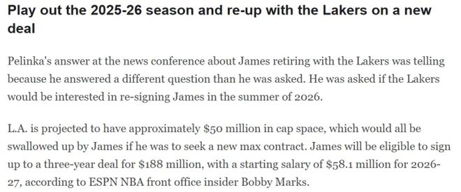詹姆斯要打到44岁?明夏有资格签3年1.88亿 起始年