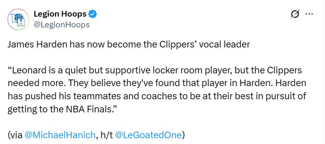 曝36岁哈登成快船真正领袖!率领新阵容冲冠:力
