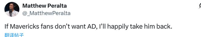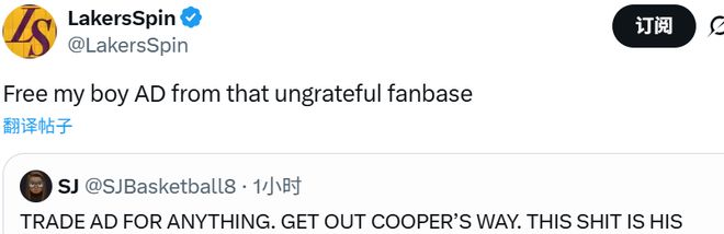雷速体育10月12日讯 今天结束的一场季前赛,独行侠116-120不敌黄蜂。 本场比赛,安东尼·戴维斯出战24分钟,投篮12中6,得到12分4篮板1助攻。 戴维斯本场的表现引发美国独行侠球迷吐槽,不仅称呼他为胖子,还喊话交易他给弗拉格让路。 对此,湖人记者Matthew Peralta发文力挺浓眉:“如果独行侠球迷不想要AD,我很乐意把他接回来。” 湖人媒体LakersSpin写道:“把我的兄弟AD从那个不知感恩的球迷群体中解放出来!” |