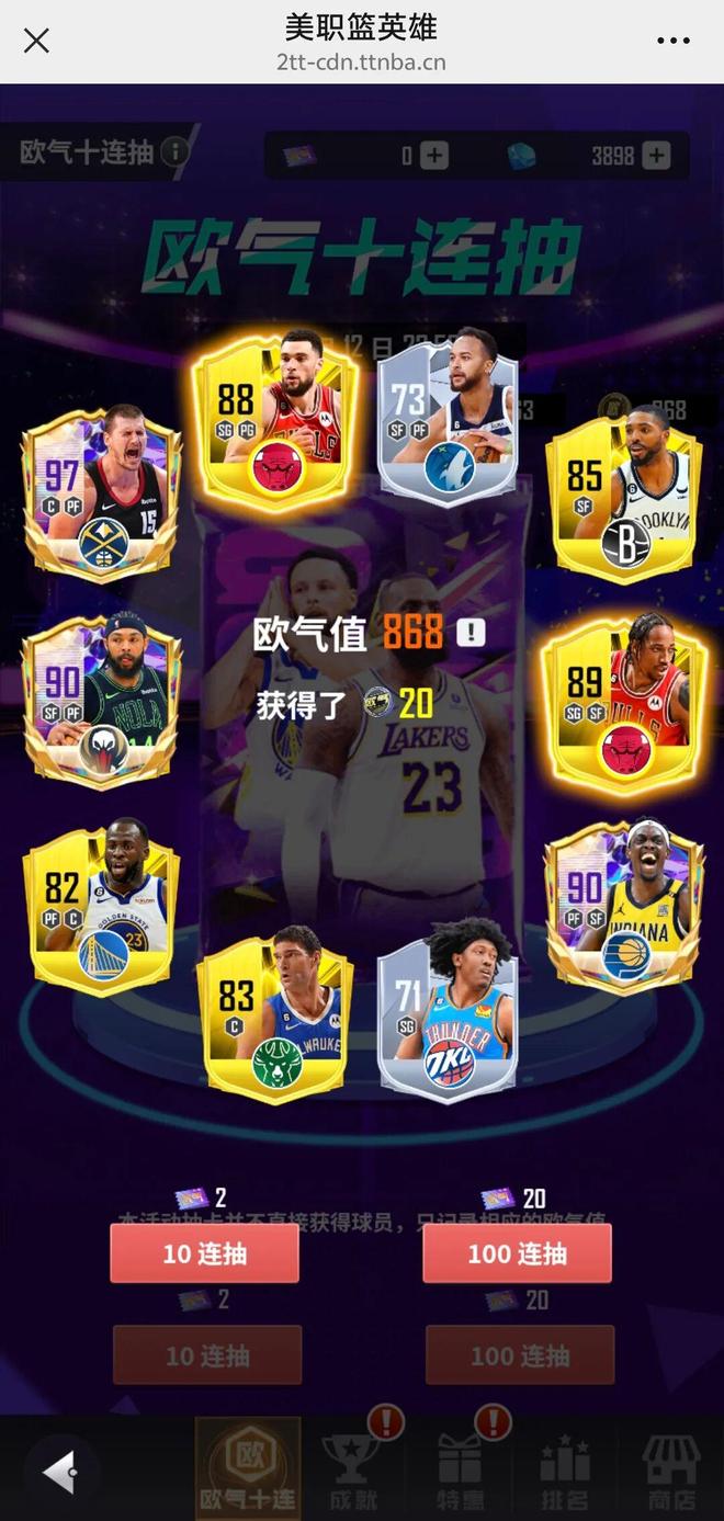 全新活动!NBA英雄2欧气十连抽来啦 一次你就有机会登上欧气or厄运榜一 保住排名就能将94铂金自选卡拿下 约老师还是库里老詹?顶级球星全任选