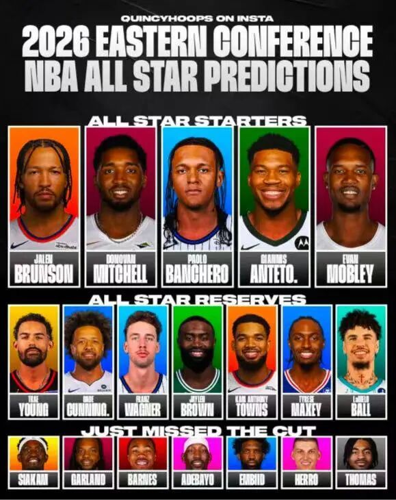 西部替补分别被预测为:布克、爱德华兹、杰伦-威廉姆斯、杜兰特、浓眉、库里、谢登-夏普。 东部那边,先发为布伦森、米切尔、班凯罗、扬尼斯、莫布利;替补:特雷杨、坎宁安、小瓦格纳、杰伦布朗、唐斯、马克西、拉梅洛鲍尔;